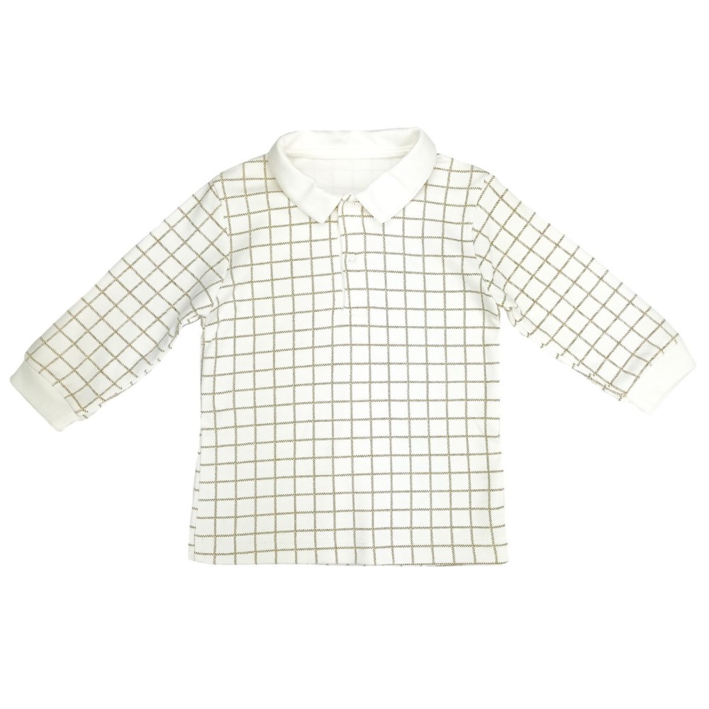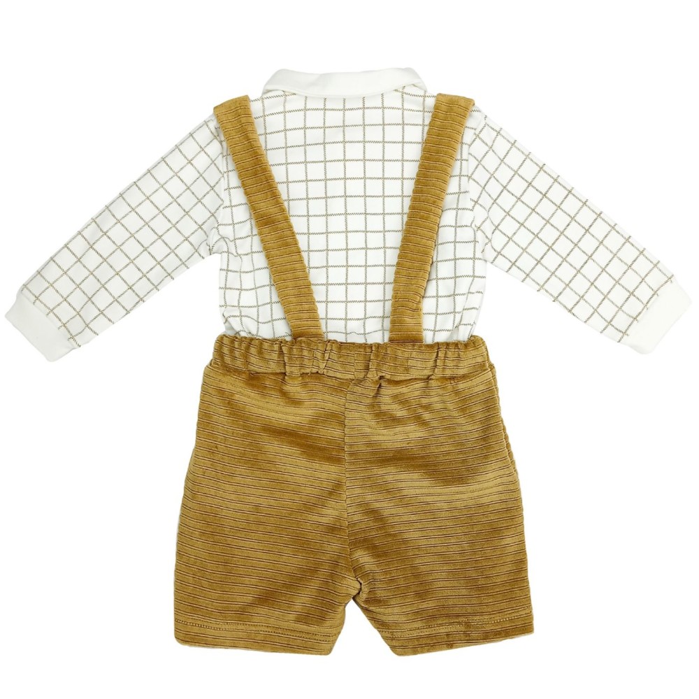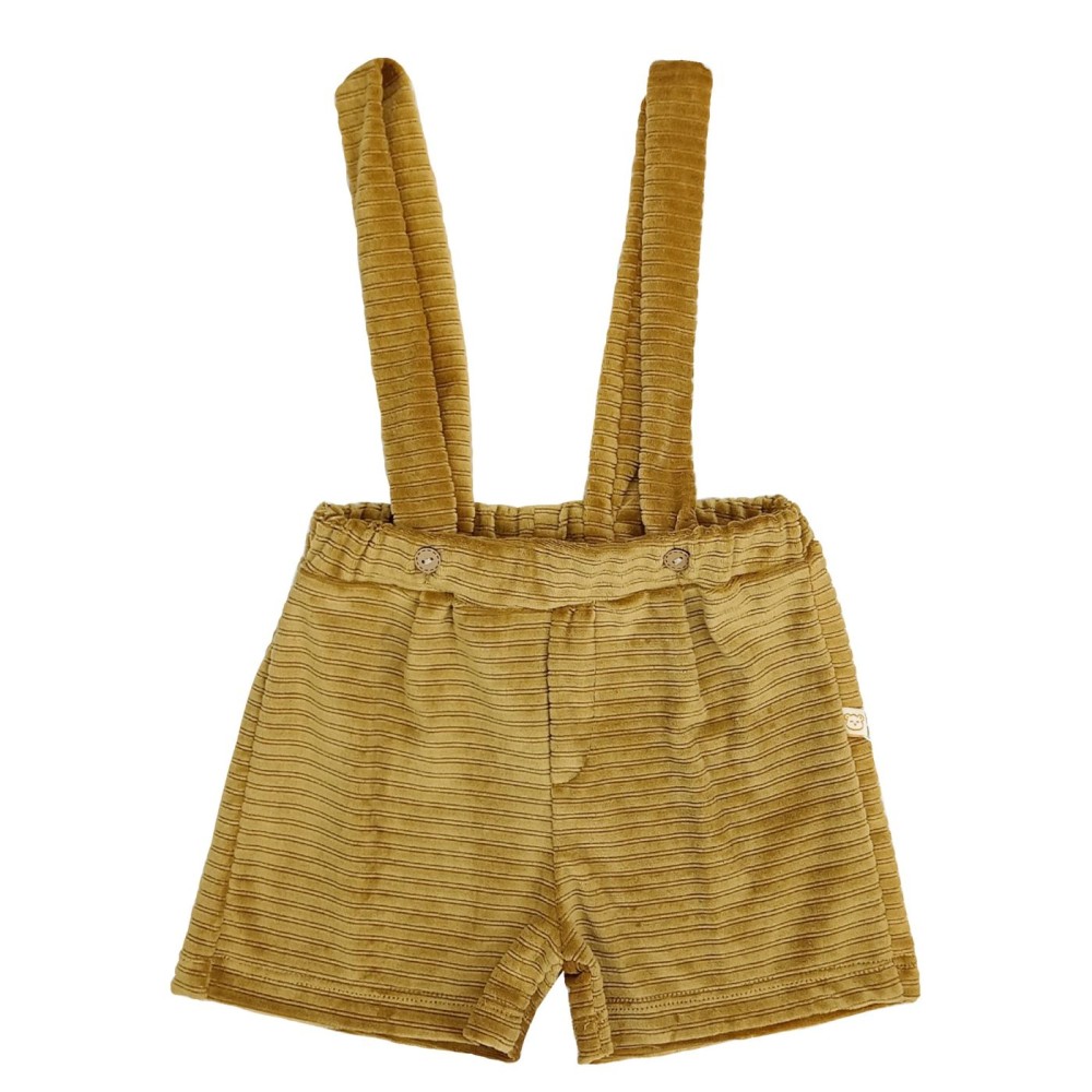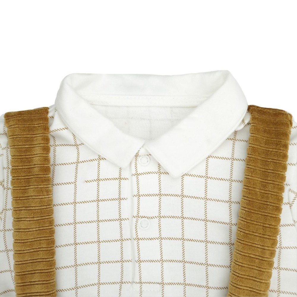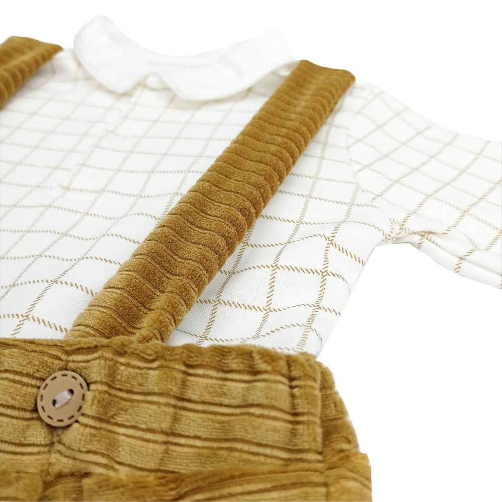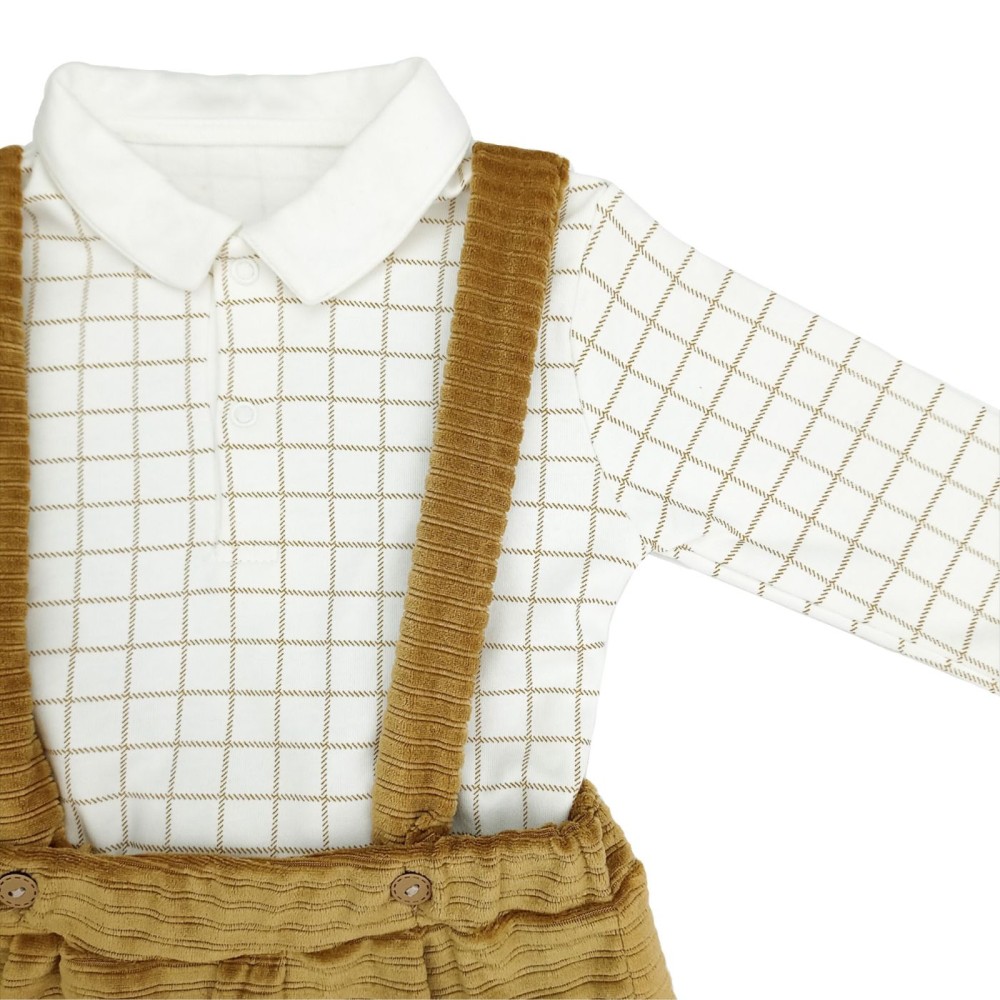 Χειμερινό σορτς με τιράντες για μωρό, στην πολυτελή απόχρωση της ώχρας, με οριζόντιες ρίγες στην ύφανση, σεταρισμένο με λευκό μακρυμάνικο μπλουζάκι, με μπεζ καρό μοτίβο. Το καρό μπλουζάκι, έχει ολόλευκο γιακά και μανσετούλες και κουμπώνει μπροστά, με 2 λευκά κουμπάκια κλιπς. Το σορτς έχει λάστιχο στη μέση για τέλεια εφαργογή. Οι μαλακές τιράντες σταθεροποιούνται μπροστά με 2 μπεζ κουμπιά με εφέ ραφής. Έχει άνετη γραμμή, οπότε αν είστε μεταξύ δύο νούμερων επιλέξτε με ασφάλεια το μικρότερο.