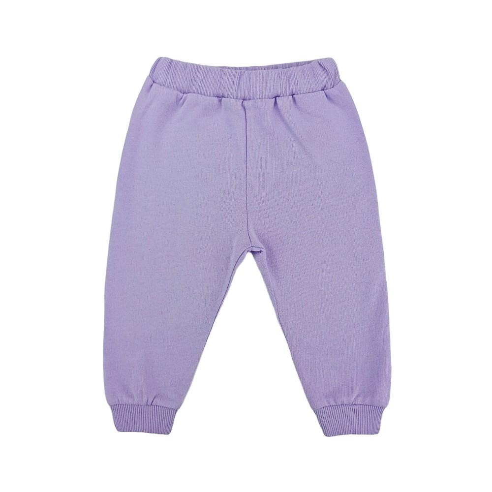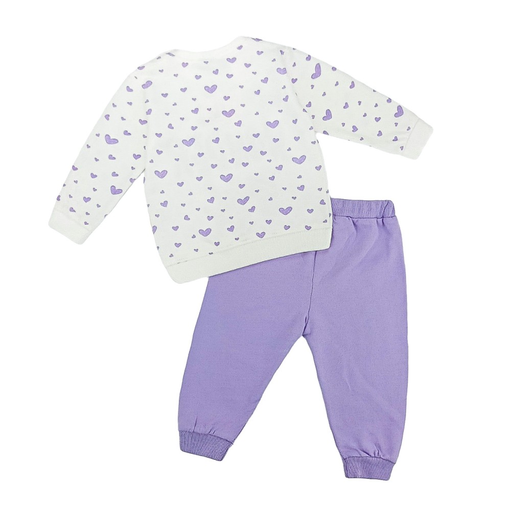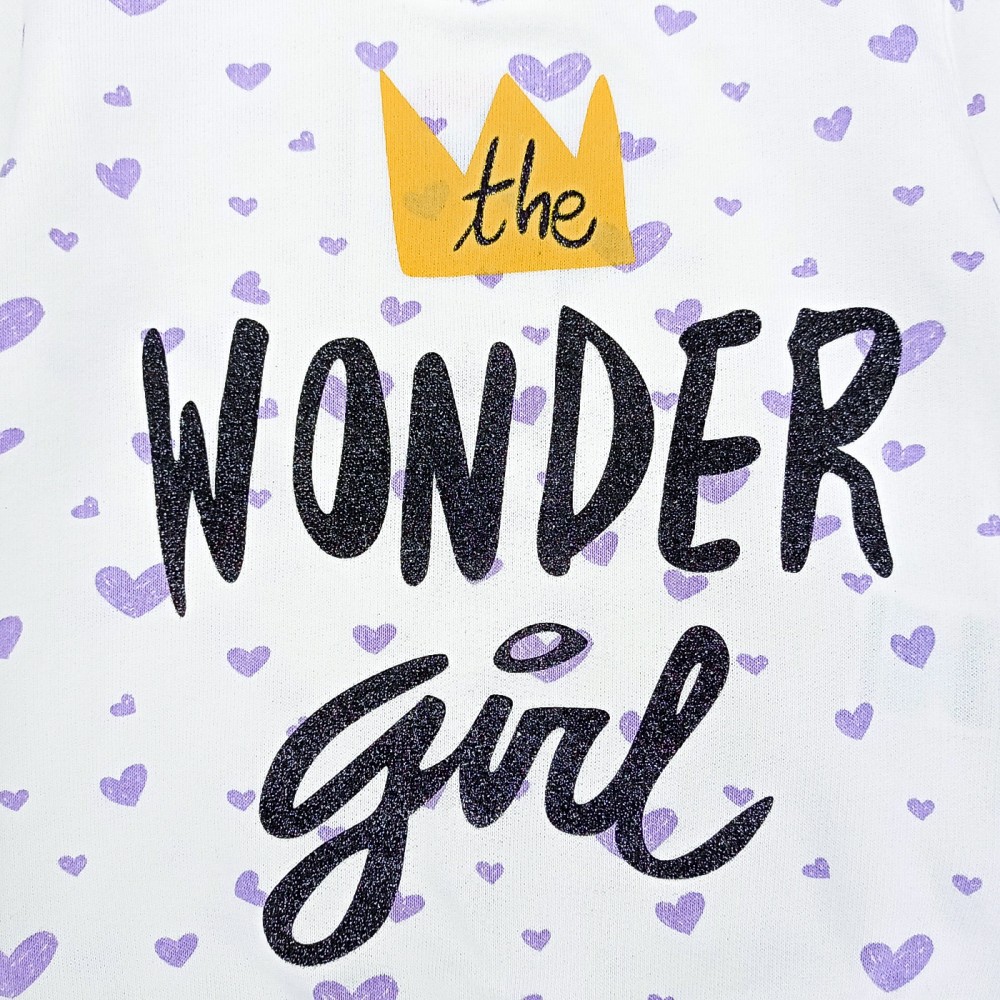 Σετ φόρμας, που αποτελείται από λευκή μπλούζα με λιλά καρδούλες και μονόχρωμο λιλά παντελόνι σε σύγχρονη αθλητική γραμμή. Στη μακρυμάνικη μπλούζα κυριαρχούν μαύρα γράμματα με glitter, με τη φράση “the WONDER girl” και ένα κίτρινο στέμμα. Δίπλα στη λαιμόκοψη υπάρχουν 2 κουμπάκια τρουκς, στο ίδιο λιλά χρώμα με τις καρδούλες, για εύκολο πέρασμα του κεφαλιού. Τα τελειώματα στη λαιμόκοψη, τις μανσέτες, τη μέση και το κάτω μέρος του παντελονιού είναι με rib ύφανση. Τέλος, οι καρδούλες έχουν χαρακτήρα ζωγραφιάς και το όμορφο μοτίβο τους καλύπτει και την πίσω πλευρά της μπλούζας.