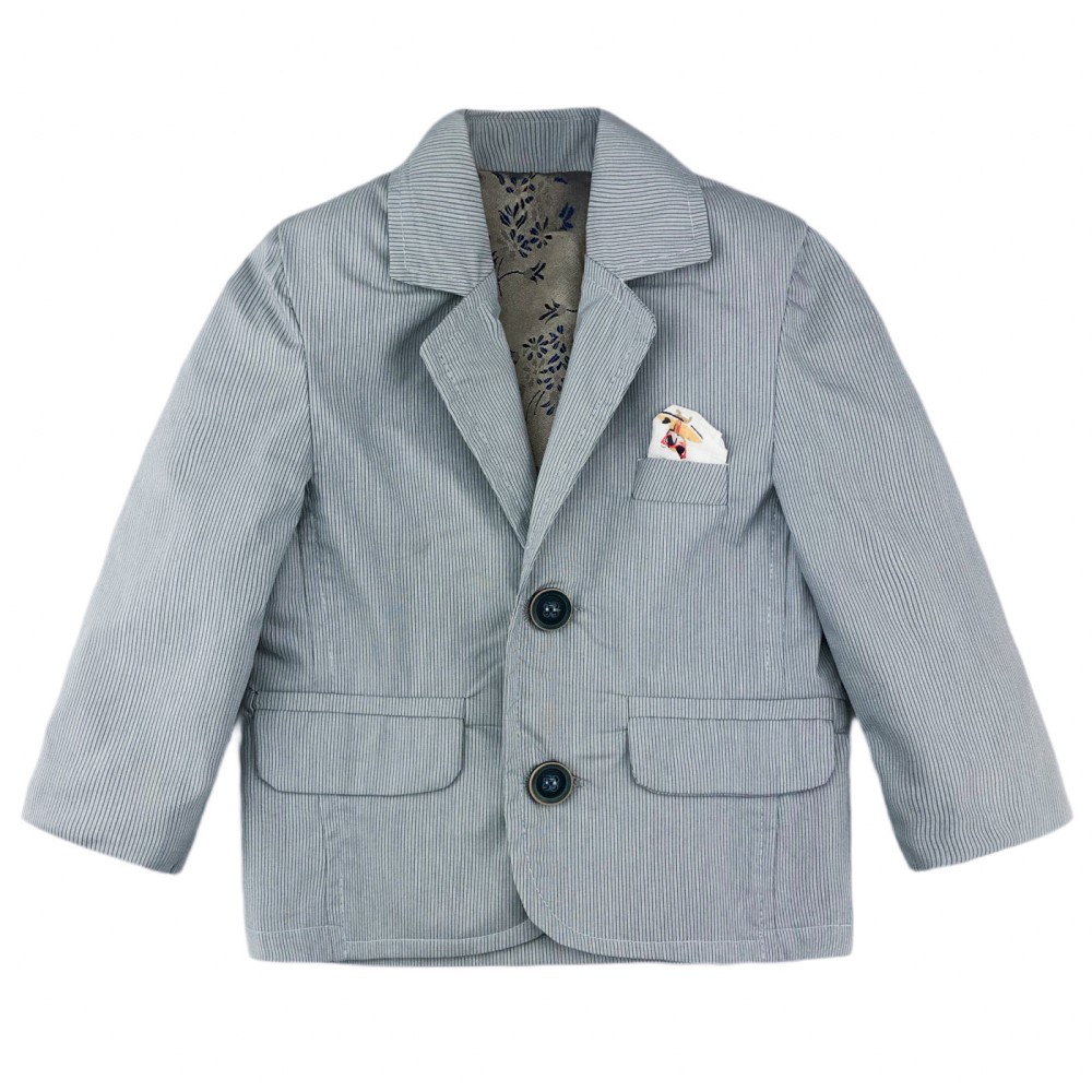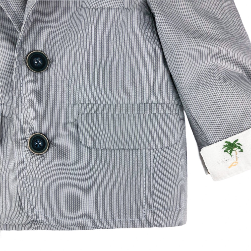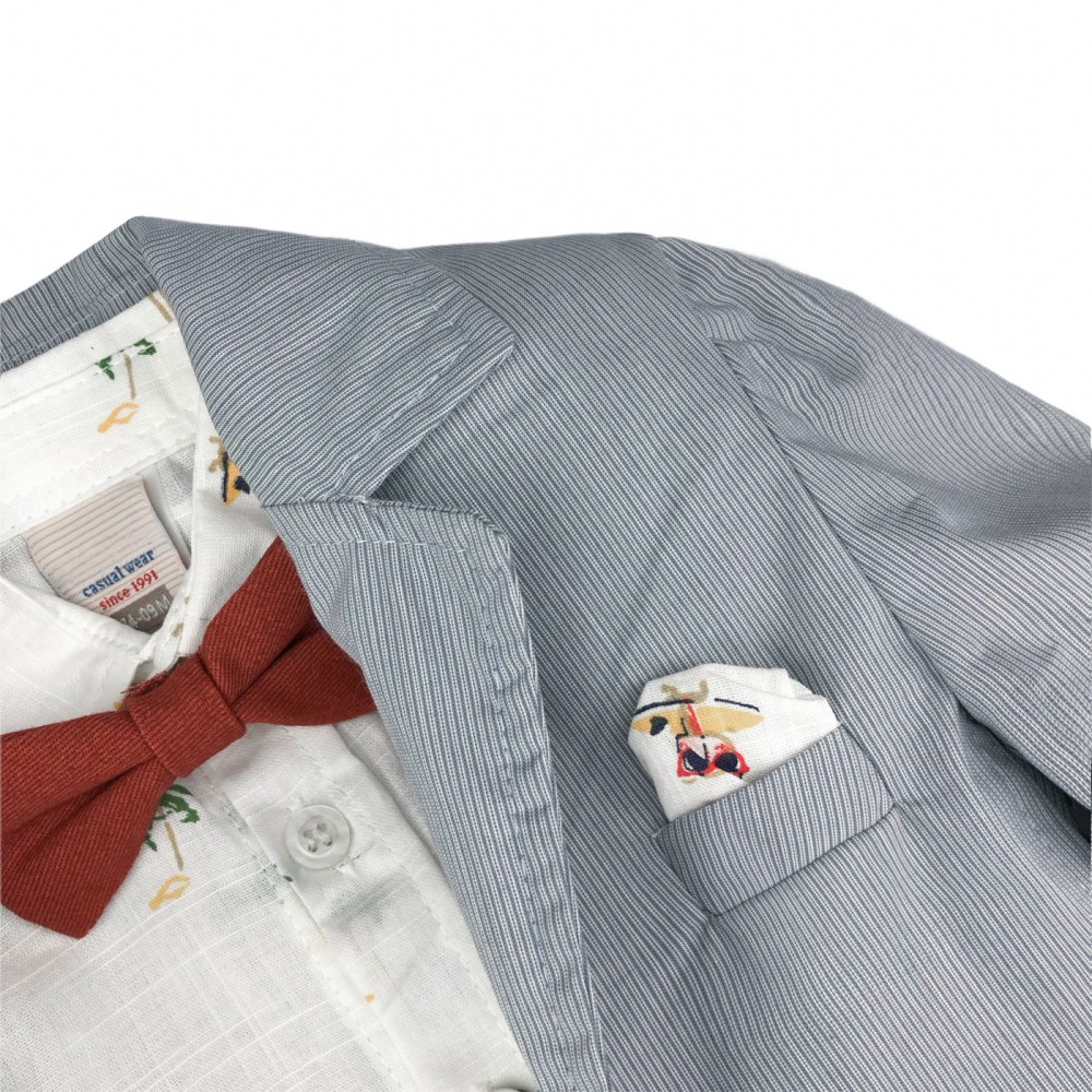 Στιλάτο κοστούμι για μωρό, τεσσάρων (4) κομματιών, εξαιρετικής ραφής. Αποτελείται από γαλάζιο σακάκι με μπλε κοκάλινα κουμπιά και ψευδοτσεπάκια στο πλάι. Το λευκό μακρυμάνικο πουκάμισο έχει διακριτικό τροπικό μοτίβο με φοίνικες, ενώ το κεραμιδί παντελονάκι είναι ασορτί με το παπιγιόν. Το σακάκι είναι επενδυμένο εσωτερικά με στιλάτη floral φόδρα. Το παντελόνι έχει εσωτερικά στο ζωνάκι, λάστιχο με κουμπάκι, για ρύθμιση της μέσης στο μέγεθος του μικρού σας.