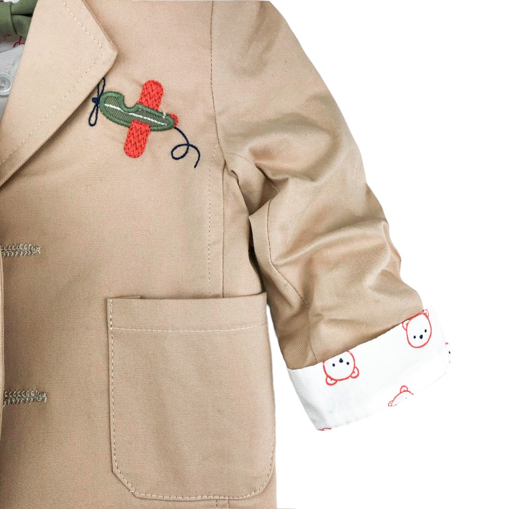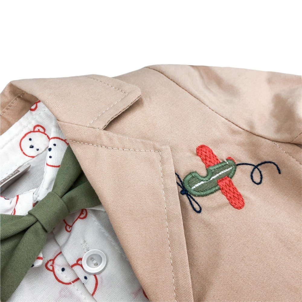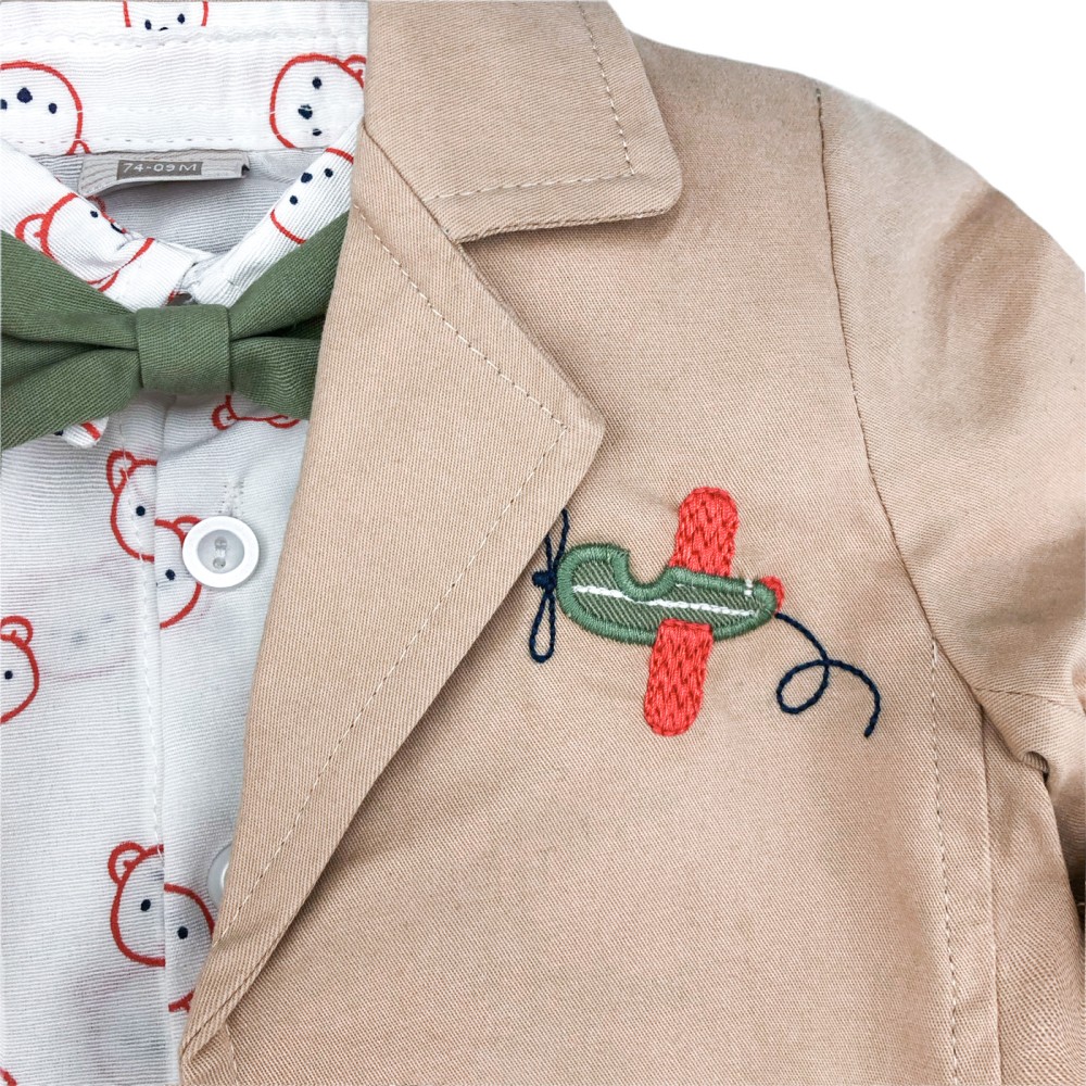 Μπεζ σακάκι με κεντημένο αεροπλανάκι, σετ με πουκάμισο με teddy μοτίβο, λαδί παντελόνι και παπιγιόν
