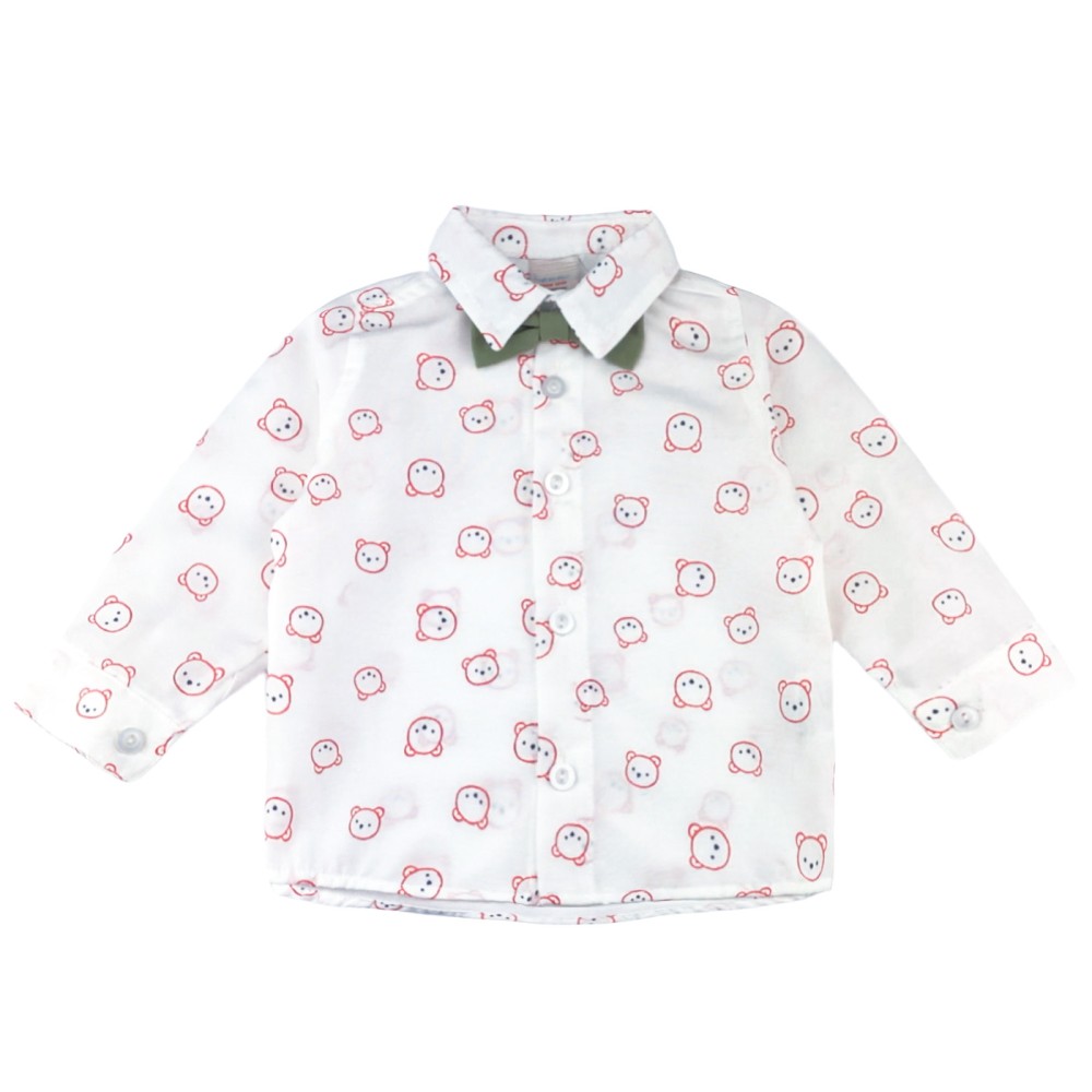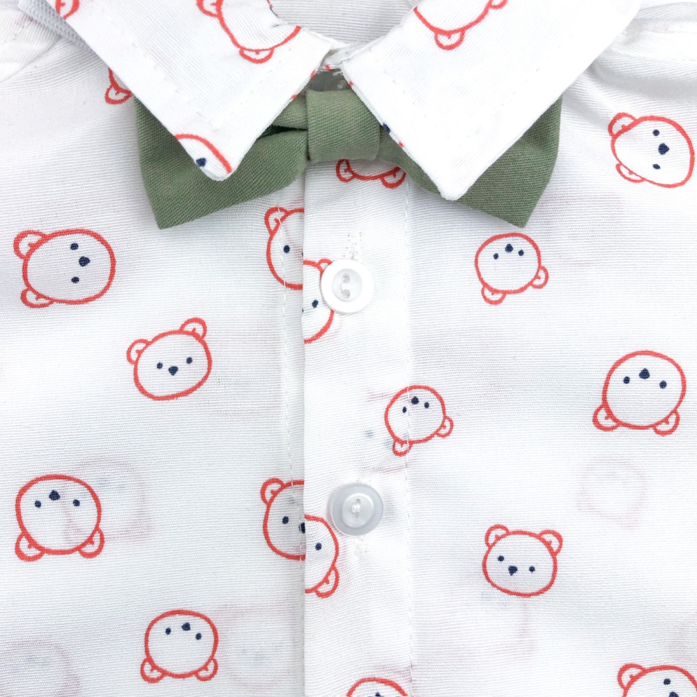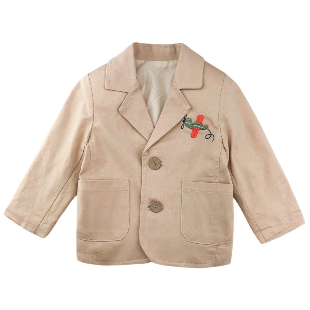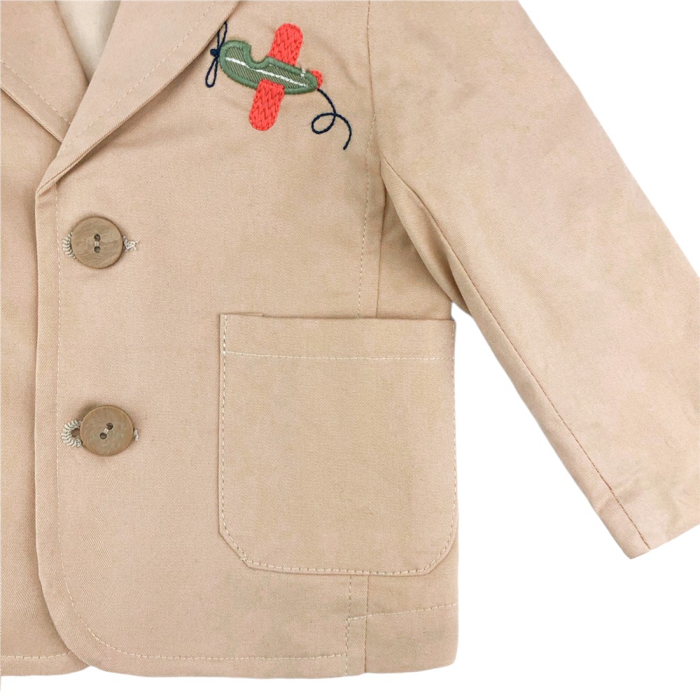 Μπεζ σακάκι με κεντημένο αεροπλανάκι, σετ με πουκάμισο με teddy μοτίβο, λαδί παντελόνι και παπιγιόν