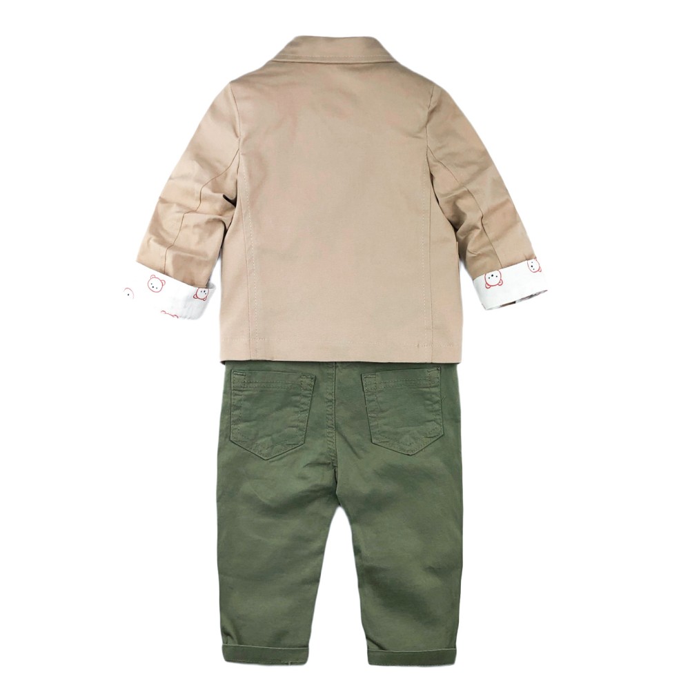 Στιλάτο κοστούμι για μωρό, τεσσάρων (4) κομματιών, εξαιρετικής ραφής. Αποτελείται από μπεζ σακάκι με ασορτί κοκάλινα κουμπιά και δύο τσέπες στο πλάι. Το λευκό μακρυμάνικο πουκάμισο έχει μίνιμαλ teddy μοτίβο, ενώ το λαδί παντελόνι είναι ασορτί με το αποσπώμενο παπιγιόν. Το σακάκι είναι επενδυμένο εσωτερικά με μπεζ φόδρα. Το παντελόνι έχει εσωτερικά στο ζωνάκι, λάστιχο με κουμπάκι, για ρύθμιση της μέσης στο ακριβές μέγεθος του μικρού σας.