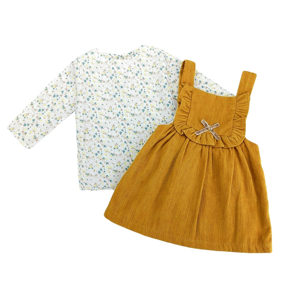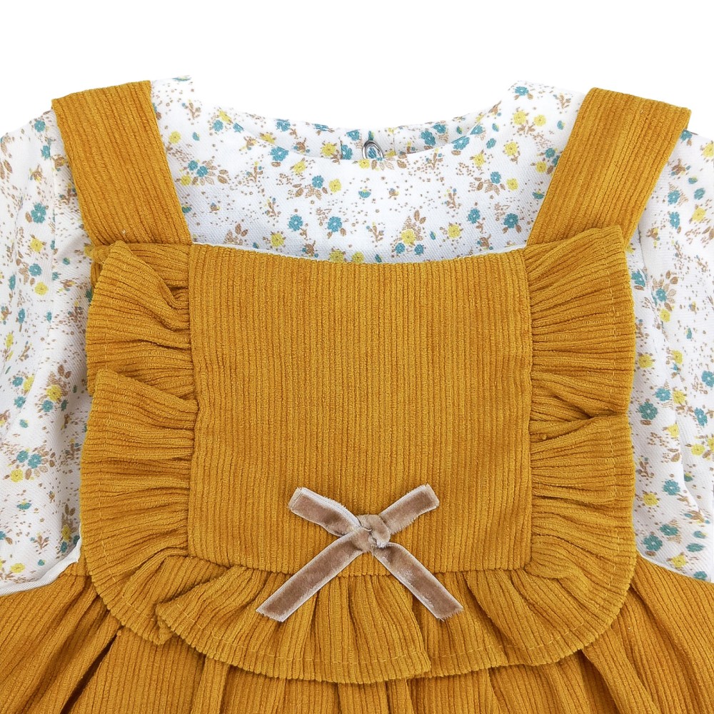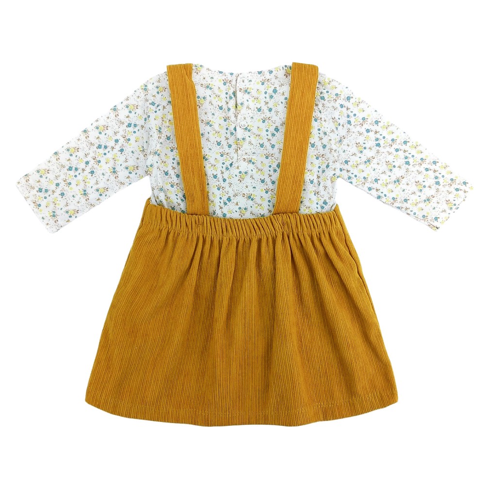 Σετ 2 κομματιών για μωρό κορίτσι που περιλαμβάνει φορεματάκι σαλοπέτα με τιράντες και μπλούζα φλοράλ λευκή, με μακρύ μανίκι. Η κοτλέ βελουτέ φούστα, είναι φοδραρισμένη και πέφτει σε άλφα γραμμή. Το πάνω μέρος της, το περιτριγυρίζει ένα βολανάκι από το ίδιο ύφασμα και ένα βελούδινο φιογκάκι. Οι τιράντες ρυθμίζονται στην πλάτη με εσωτερικά κουμπάκια, ανάλογα με το ύψος του παιδιού, ενώ στη μεσούλα υπάρχει ελαστική σουρίτσα για τέλεια εφαρμογή του ρούχου. Το floral μοτίβο της μπλούζας ακολουθεί τις ίδιες αποχρώσεις της σαλοπέτας και κλείνει στο πίσω μέρος με 2 λευκά κουμπάκια κλιπς για εύκολο ντύσιμο.