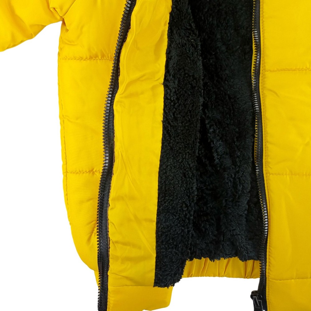 Παιδικό μπουφάν σε μουσταρδί χρώμα, με μαύρη γούνινη επένδυση και 3D λεπτομέρειες στην κουκούλα