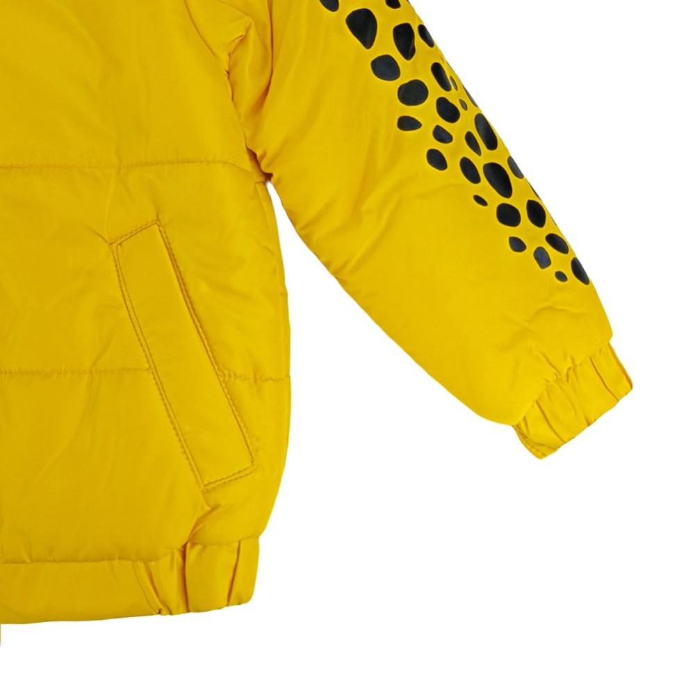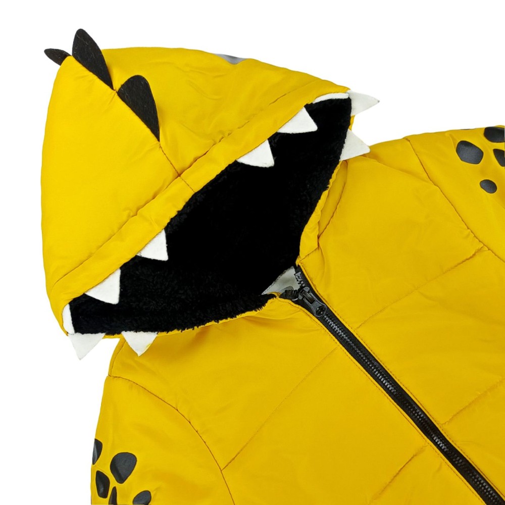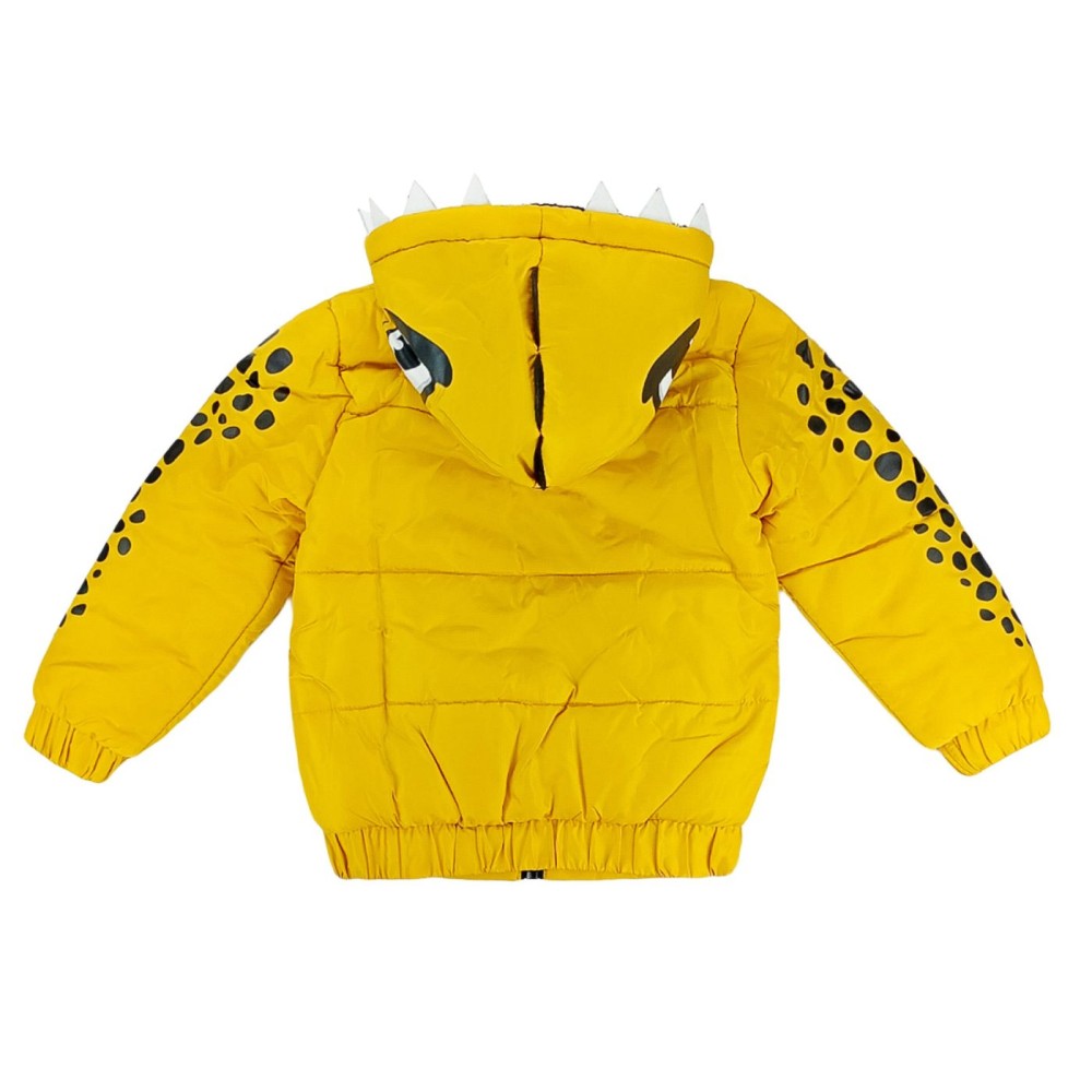 Παιδικό μπουφάν σε κίτρινο μουσταρδί χρώμα με εντυπωσιακή κουκούλα! Εσωτερικά έχει γούνινη, μαύρη επένδυση. Στο μπουφάν πρωταγωνιστεί ο χαρακτήρας δεινόσαυρος με μαύρες βούλες στα μανίκια! Η κουκούλα έχει μάτια στις δύο πλευρές της, 3D δόντια στο τελείωμα και δρακολοφίο στο πάνω μέρος. Κουμπώνει με μαύρο φερμουάρ και έχει 2 τσέπες δεξιά και αριστερά!