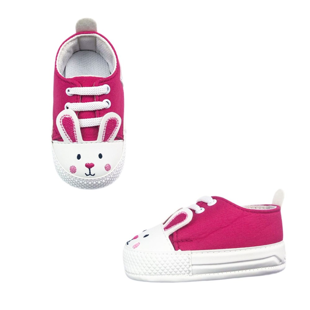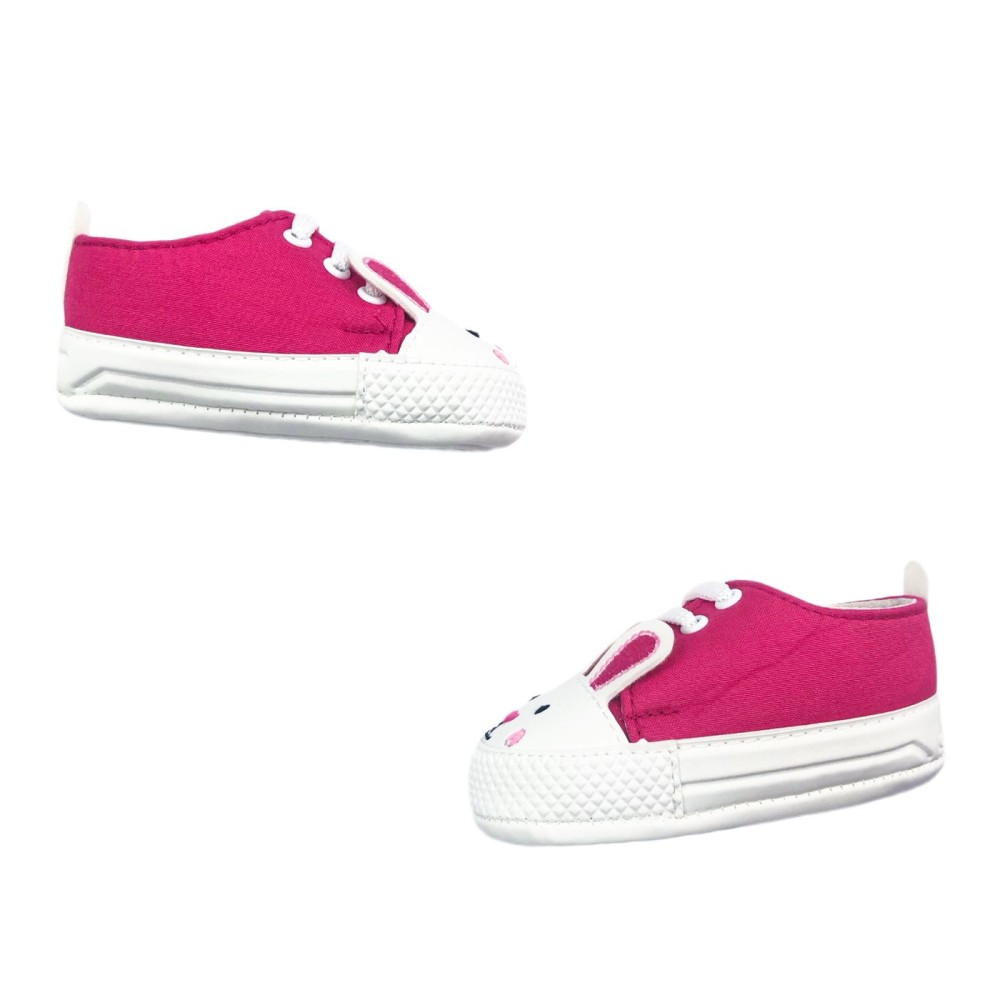 Παπούτσια αγκαλιάς bunny για μωρό, σε λευκό ή φούξια χρώμα. Στο μπροστινό μέρος σχηματίζεται με κέντημα ένα μουτράκι κουνελιού, με τρισδιάστατα αυτιά. Είναι μαλακά, με σύγχρονη αισθητική, ενώ δημιουργήθηκαν για να υποστηρίξουν ένα μωρό κατά την περίοδο του μπουσουλήματος, πριν από τα πρώτα του βήματα! Το εξωτερικό μέρος τους είναι κατασκευασμένο από συνθετικό υλικό, ενώ εσωτερικά έχουν μαλακή επένδυση. Έχουν δετά λευκά κορδόνια, για ασφαλή εφαρμογή στο ποδαράκι του μωρού. Με στυλάτες λεπτομέρειες λευκής δερματίνης στο πίσω μέρος και μαλακή και ελαφριά λευκή σόλα.