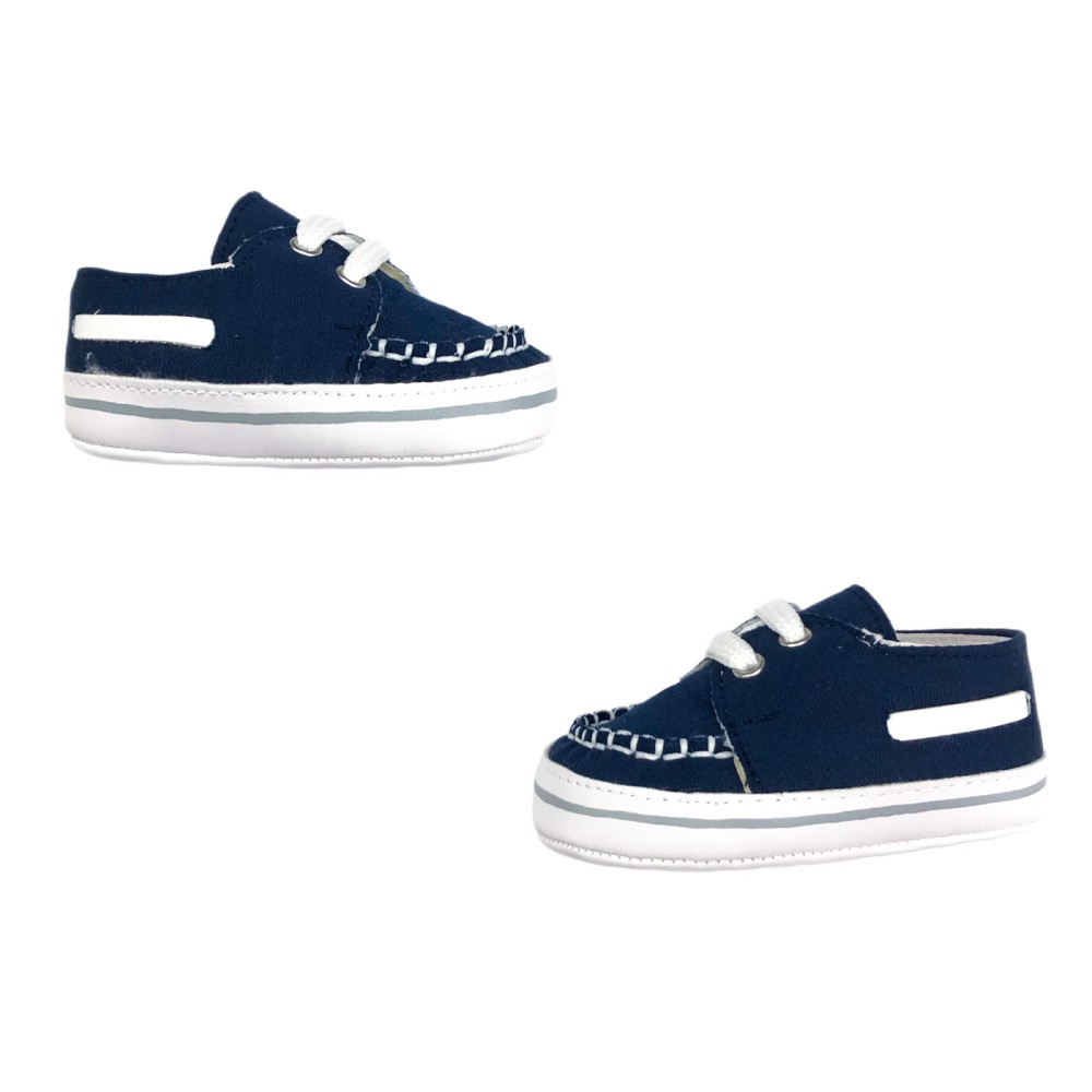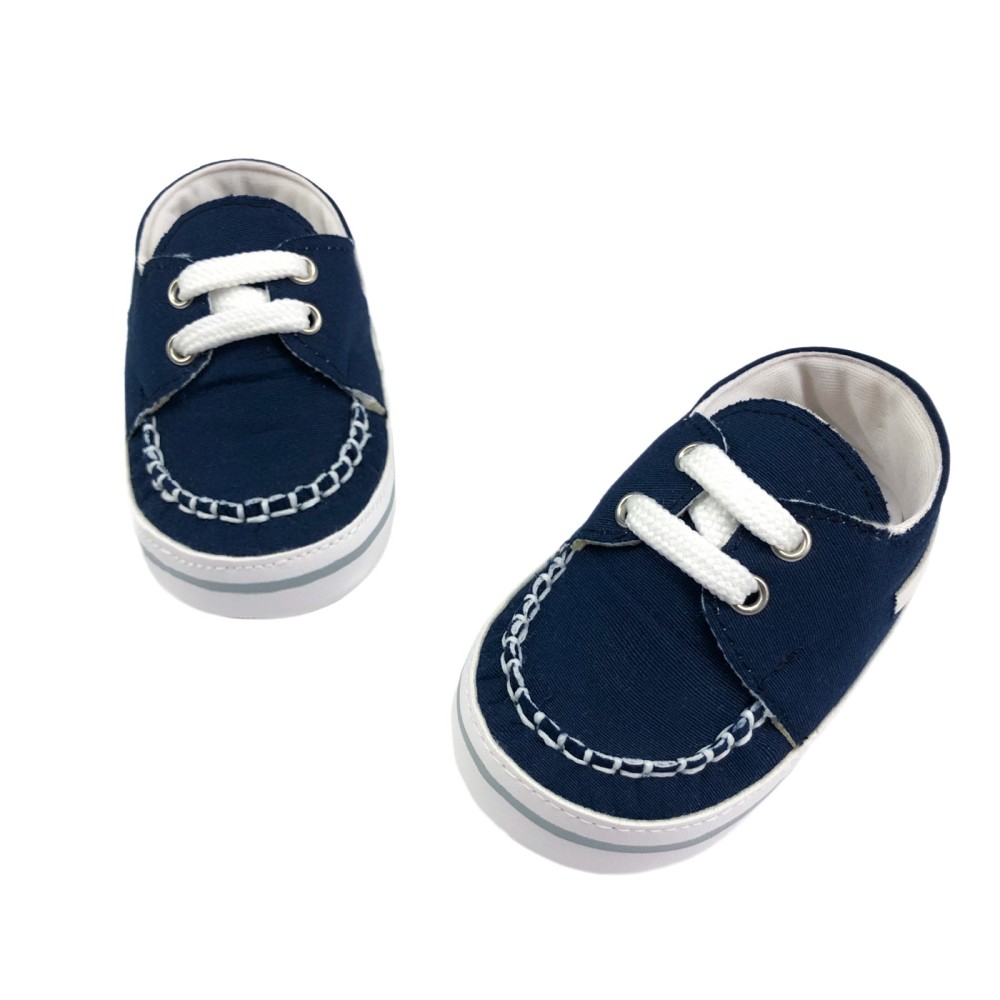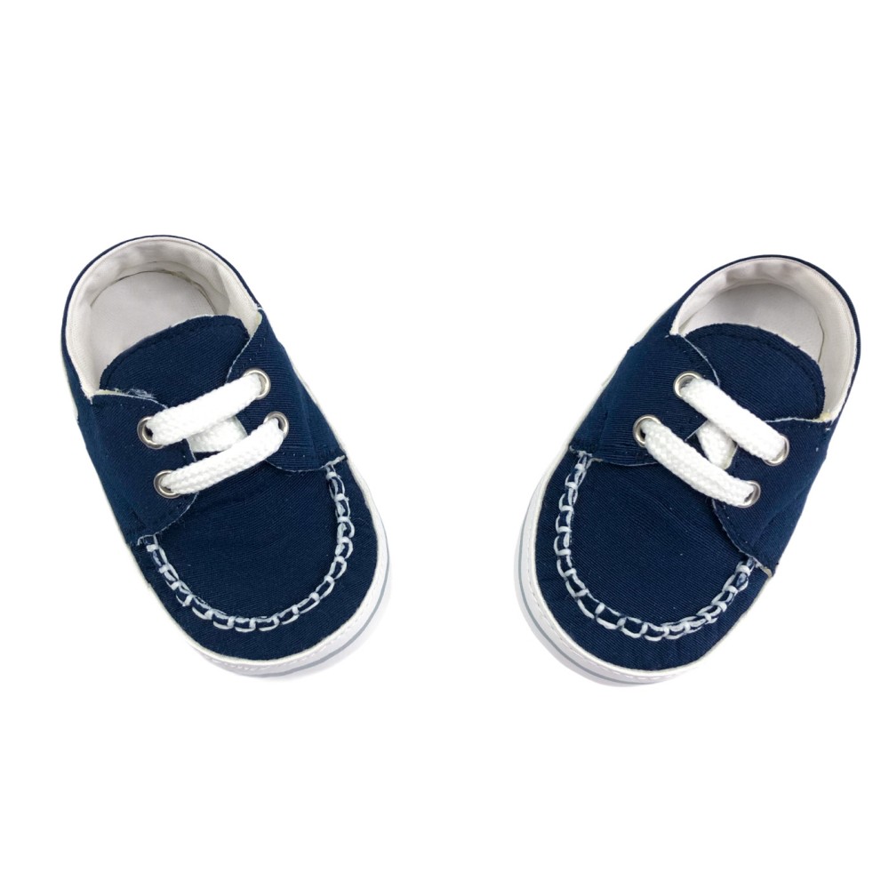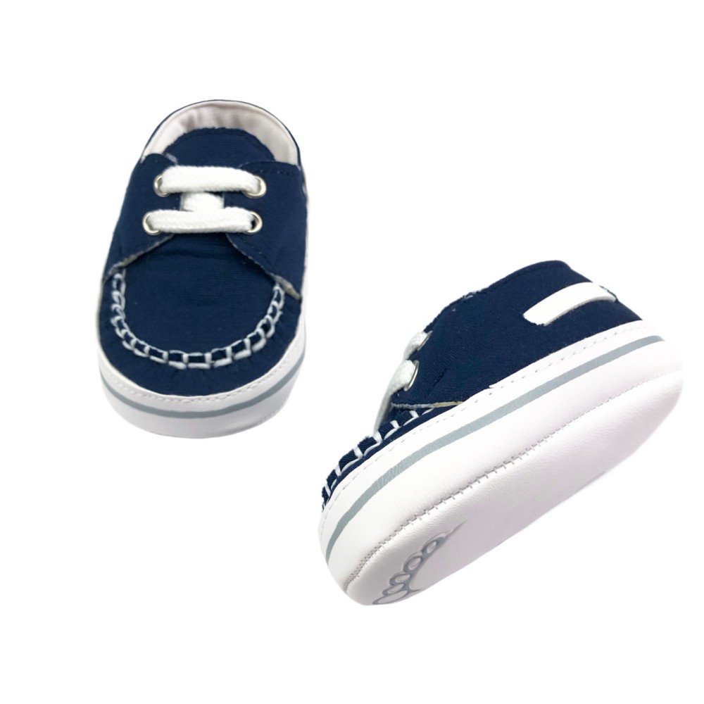 Παπούτσια αγκαλιάς για μωρό τύπου boat, σε σκούρο μπλε χρώμα, με λευκές λεπτομέρειες