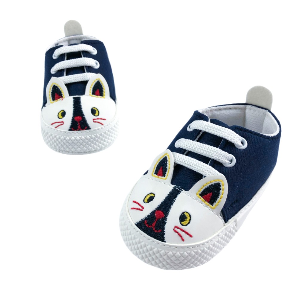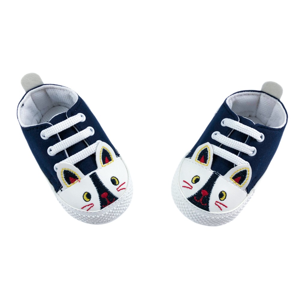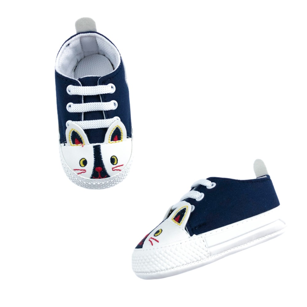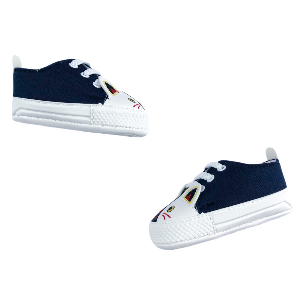 Unisex παπούτσια αγκαλιάς για μωρό σε σκούρο μπλε χρώμα. Στο μπροστινό μέρος σχηματίζεται με κέντημα ένα μουτράκι ζώου, με τρισδιάστατα αυτάκια. Είναι μαλακά, με σύγχρονη αισθητική, ενώ δημιουργήθηκαν για να υποστηρίξουν ένα μωρό κατά την περίοδο του μπουσουλήματος, πριν από τα πρώτα του βήματα! Το εξωτερικό μέρος τους είναι κατασκευασμένο από συνθετικό υλικό, ενώ εσωτερικά έχουν μαλακή επένδυση. Έχουν δετά λευκά κορδόνια, για ασφαλή εφαρμογή στο ποδαράκι του μωρού. Με στυλάτες λεπτομέρειες λευκής δερματίνης στο πίσω μέρος και μαλακή και ελαφριά λευκή σόλα.