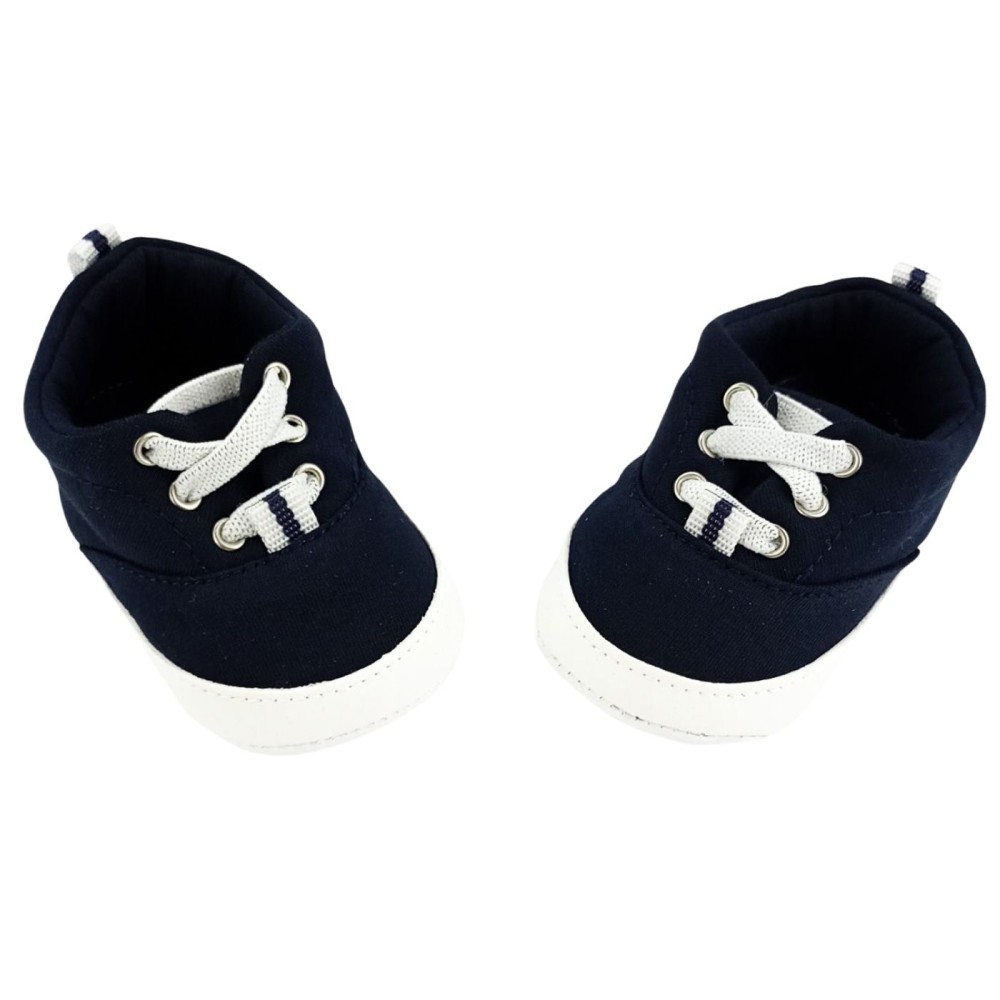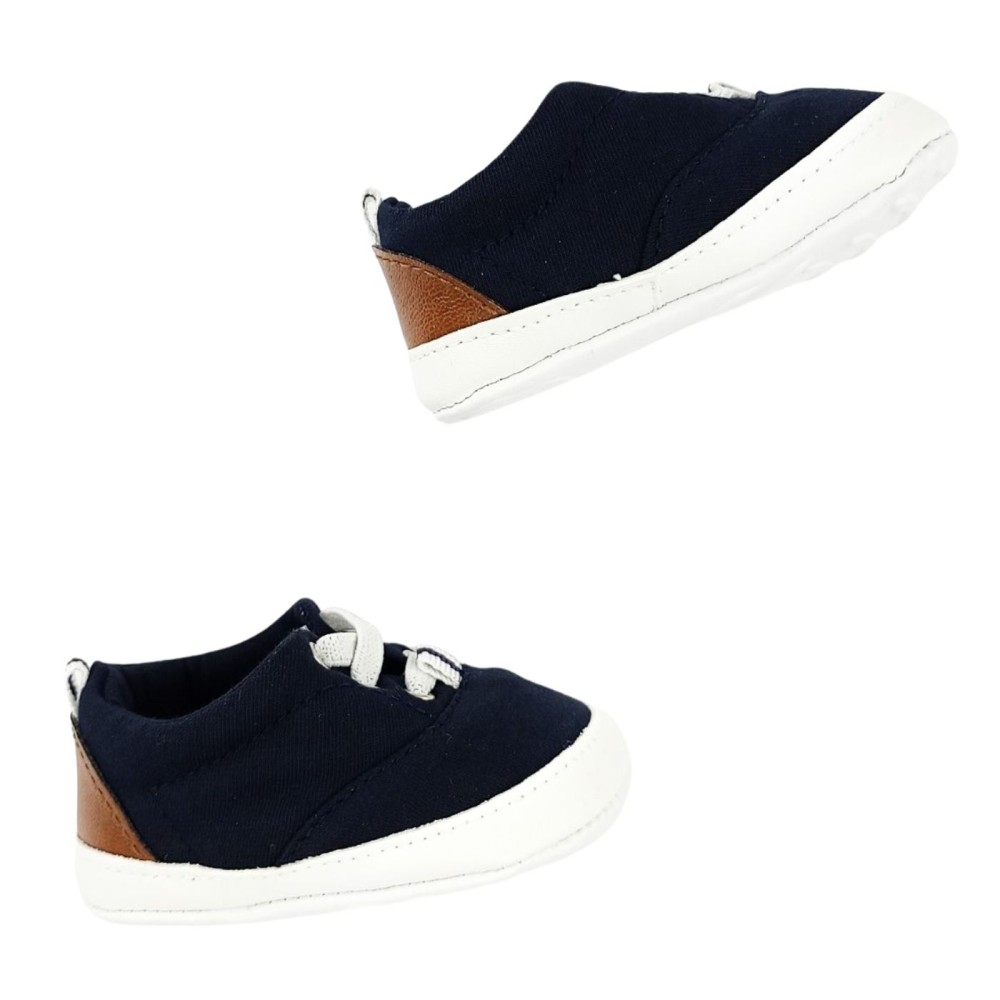 Βρεφικά πάνινα παπούτσια αγκαλιάς, βαμβακερά 100% στο εσωτερικό τους και unisex. Έχουν σκούρο μπλε χρώμα, με λευκή μαλακή σόλα, λεπτομέρεια από συνθετικό καφέ δέρμα και ελαστικά κορδόνια για άνετη εφαρμογή. Η επενδυμένη ενδιάμεση σόλα προσφέρει άνεση και είναι όπως επιβάλλεται σε αυτές τις ηλικίες πολύ ελαφριά, διευκολύνοντας τα πρώτα βηματάκια του μωρού.