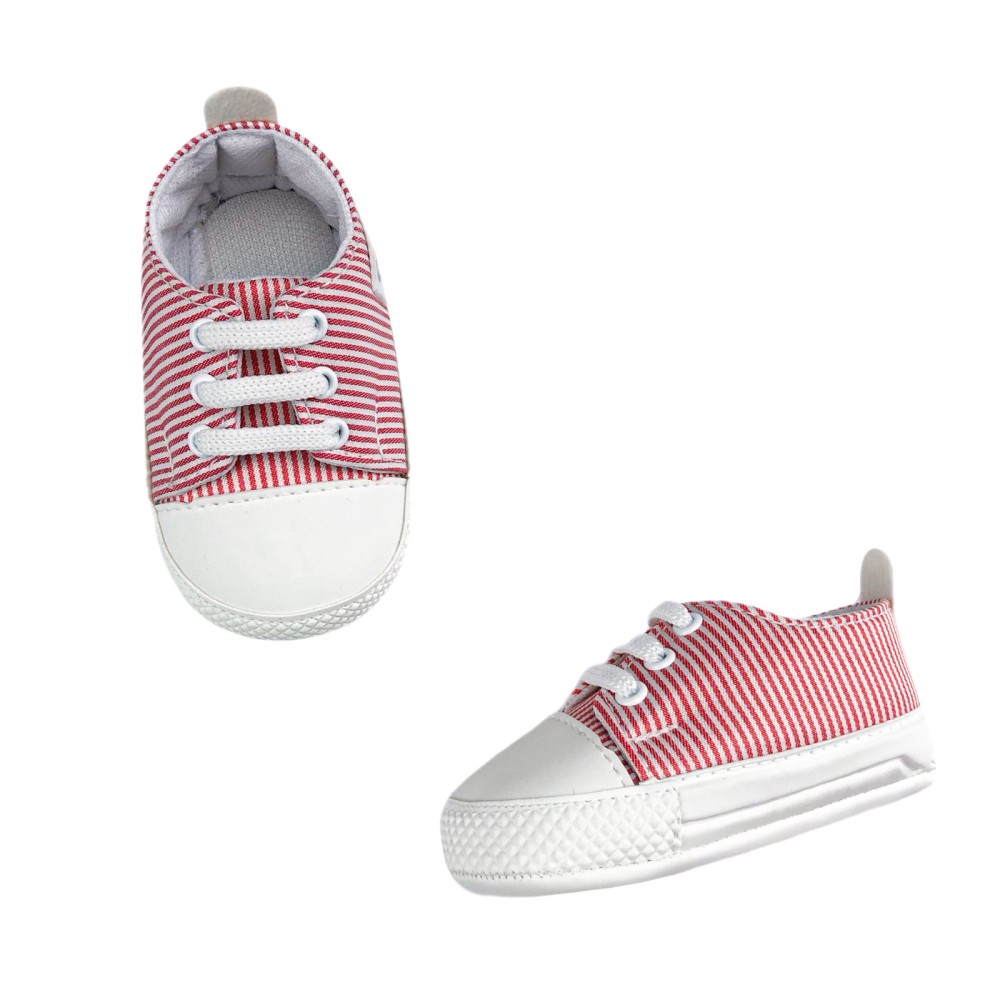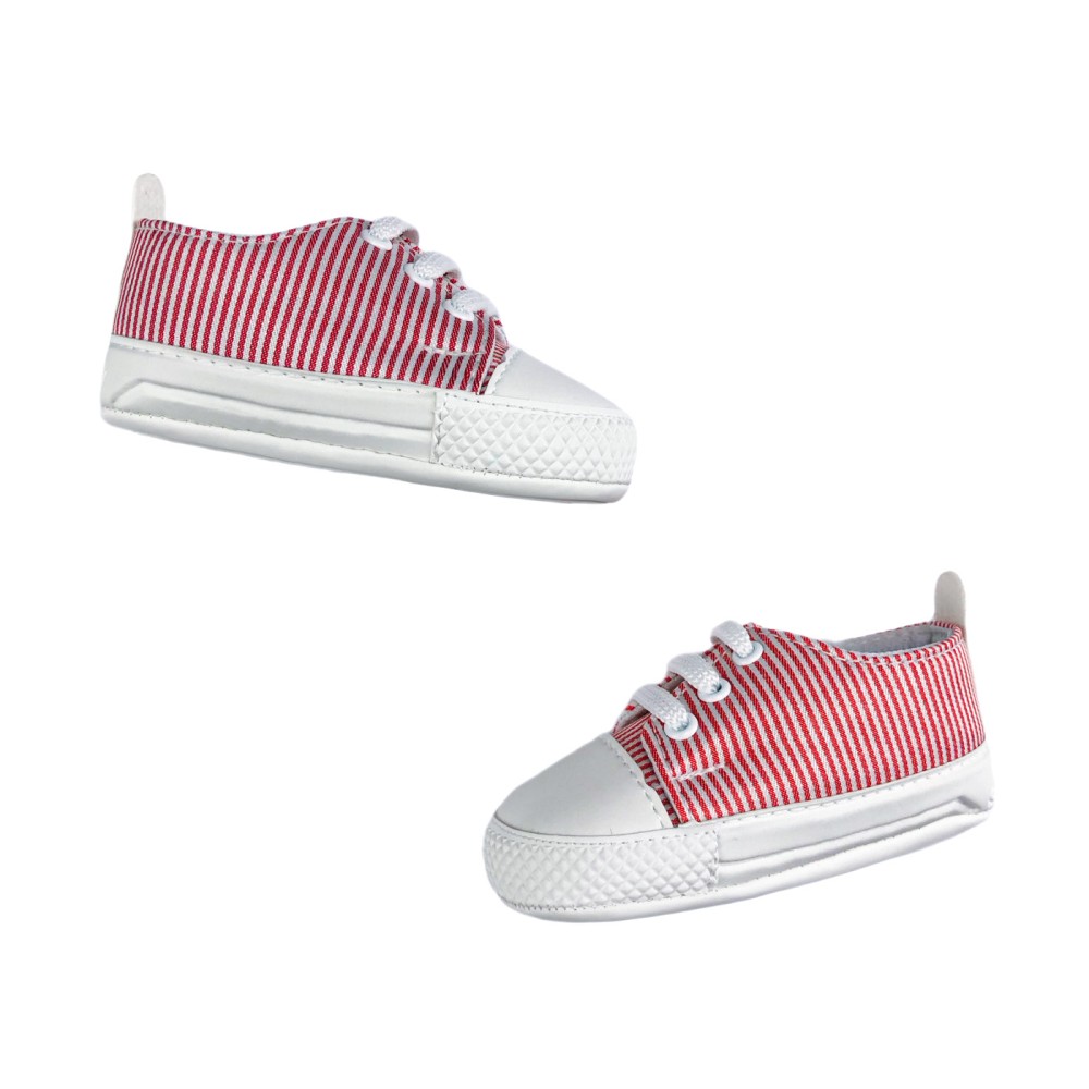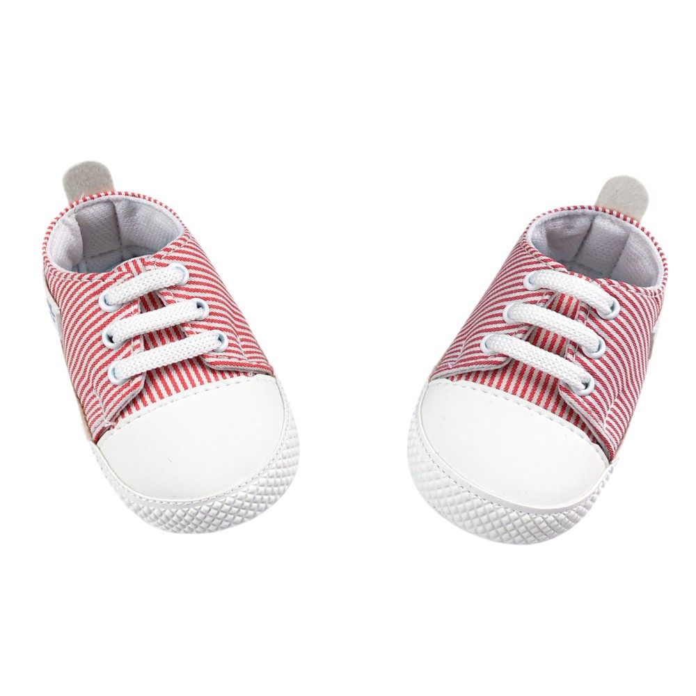 Unisex παπούτσια αγκαλιάς για μωρό με λεπτές κόκκινες και λευκές ρίγες. Είναι μαλακά, με σύγχρονη αισθητική, ενώ δημιουργήθηκαν για να υποστηρίξουν ένα μωρό κατά την περίοδο του μπουσουλήματος, πριν από τα πρώτα του βήματα! Το εξωτερικό μέρος τους είναι κατασκευασμένο από συνθετικό υλικό, ενώ εσωτερικά έχουν μαλακή επένδυση, ειδικά σχεδιασμένα για τα λιλιπούτεια πόδια. Έχουν δετά κορδόνια, για ασφαλή εφαρμογή στο ποδαράκι του μωρού. Με στυλάτες λεπτομέρειες λευκής δερματίνης στο πίσω μέρος και λευκή μαλακή και ελαφριά σόλα.