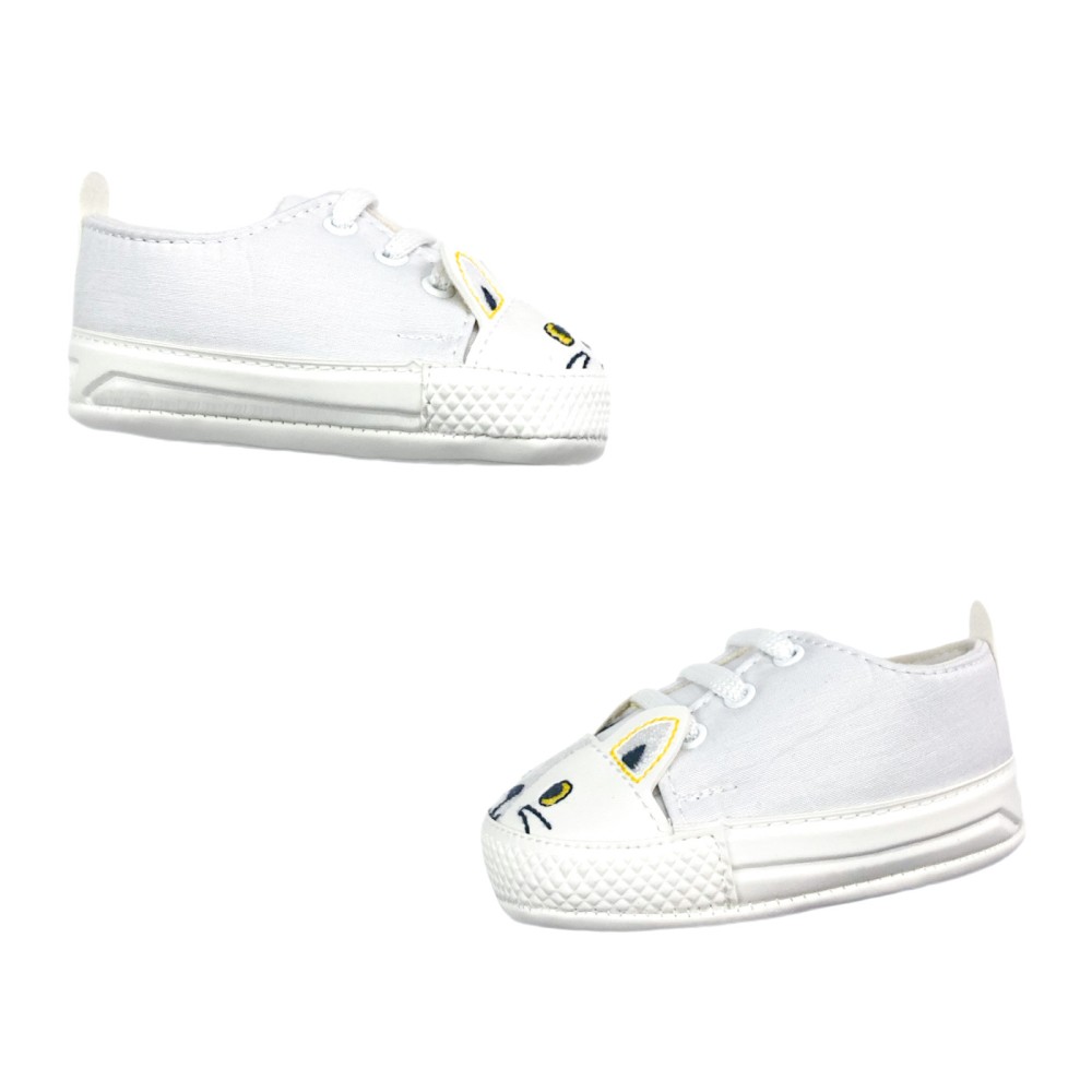 Unisex παπούτσια αγκαλιάς για μωρό σε ολόλευκο χρώμα, με κίτρινες λεπτομέρειες. Στο μπροστινό μέρος σχηματίζεται με κέντημα ένα μουτράκι γάτας, με τρισδιάστατα αυτάκια. Είναι μαλακά, με σύγχρονη αισθητική, ενώ δημιουργήθηκαν για να υποστηρίξουν ένα μωρό κατά την περίοδο του μπουσουλήματος, πριν από τα πρώτα του βήματα! Το εξωτερικό μέρος τους είναι κατασκευασμένο από συνθετικό υλικό, ενώ εσωτερικά έχουν μαλακή επένδυση. Έχουν δετά λευκά κορδόνια, για ασφαλή εφαρμογή στο ποδαράκι του μωρού. Με στυλάτες λεπτομέρειες λευκής δερματίνης στο πίσω μέρος και λευκή μαλακή και ελαφριά σόλα.