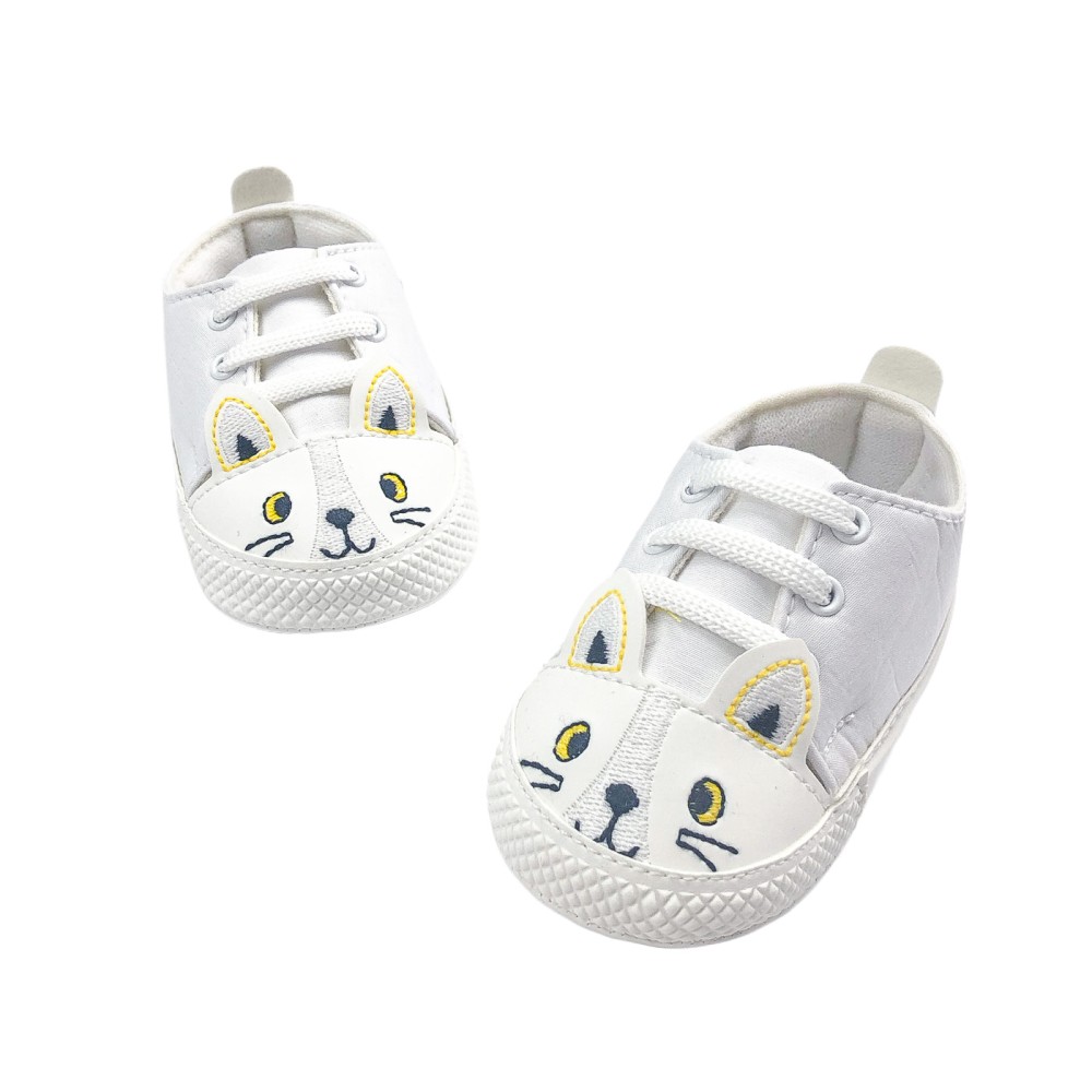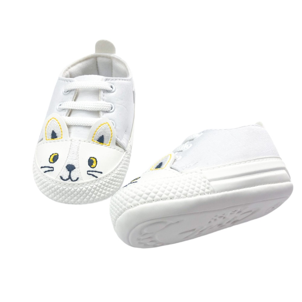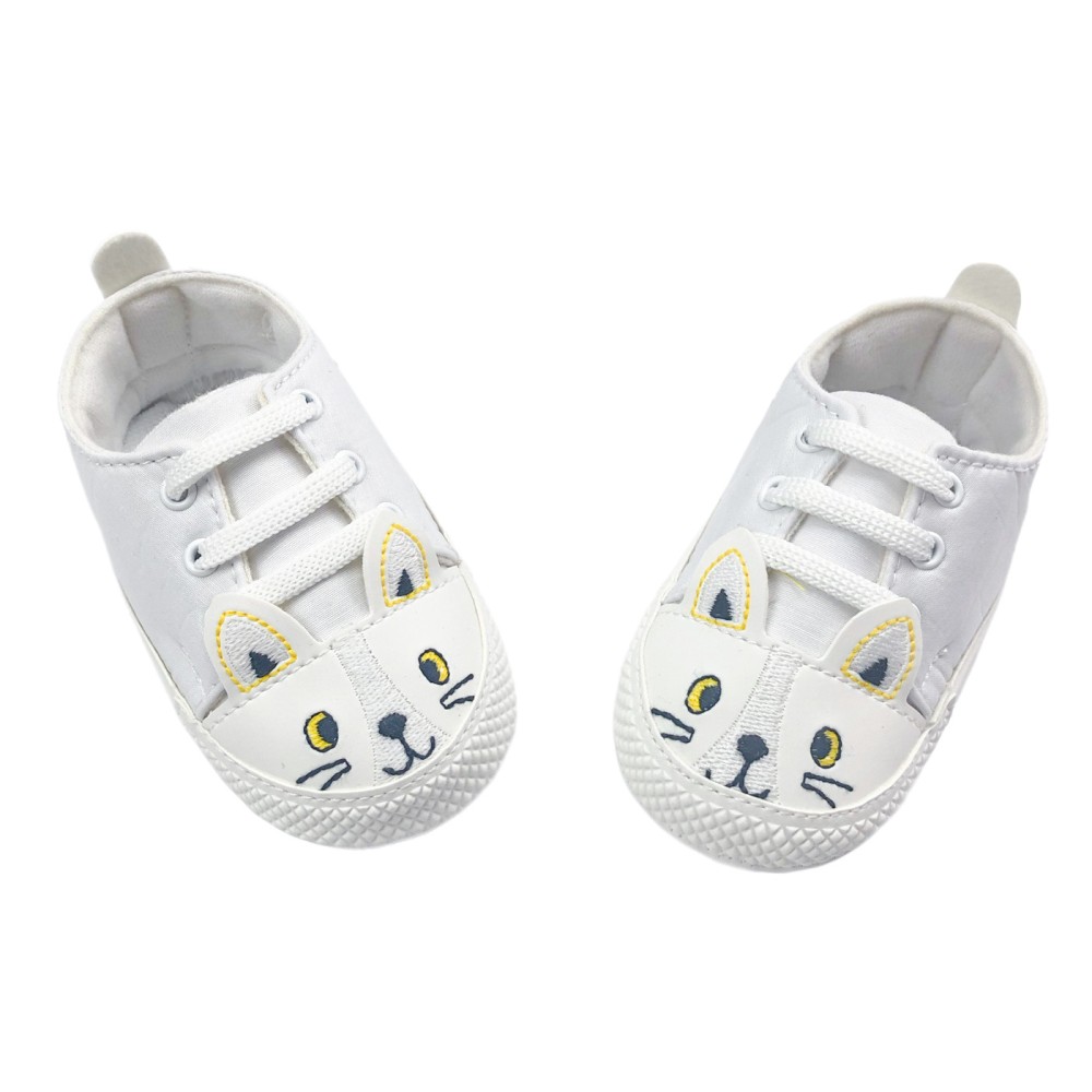 Λευκά παπούτσια αγκαλιάς με κορδόνια, λευκή σόλα και κεντημένο γατάκι με 3d αυτάκια στο μπροστινό μέρος