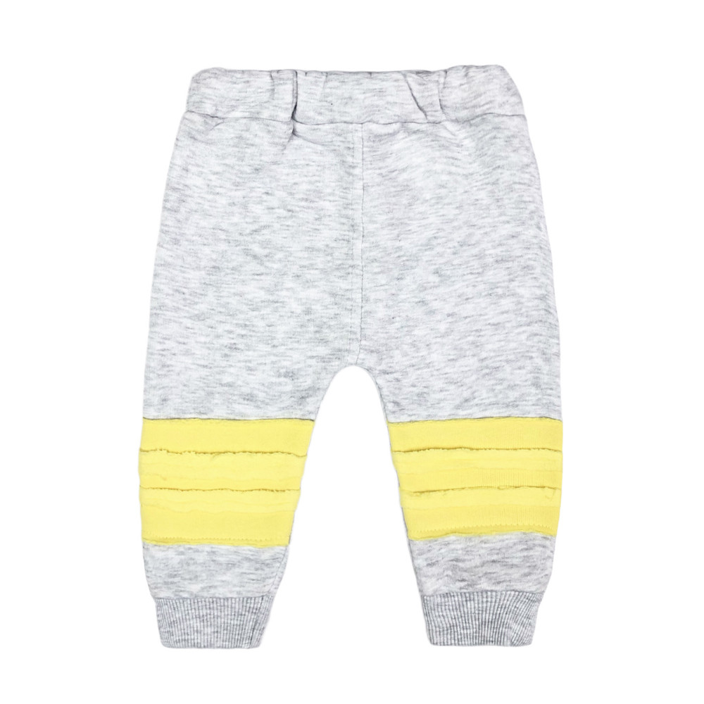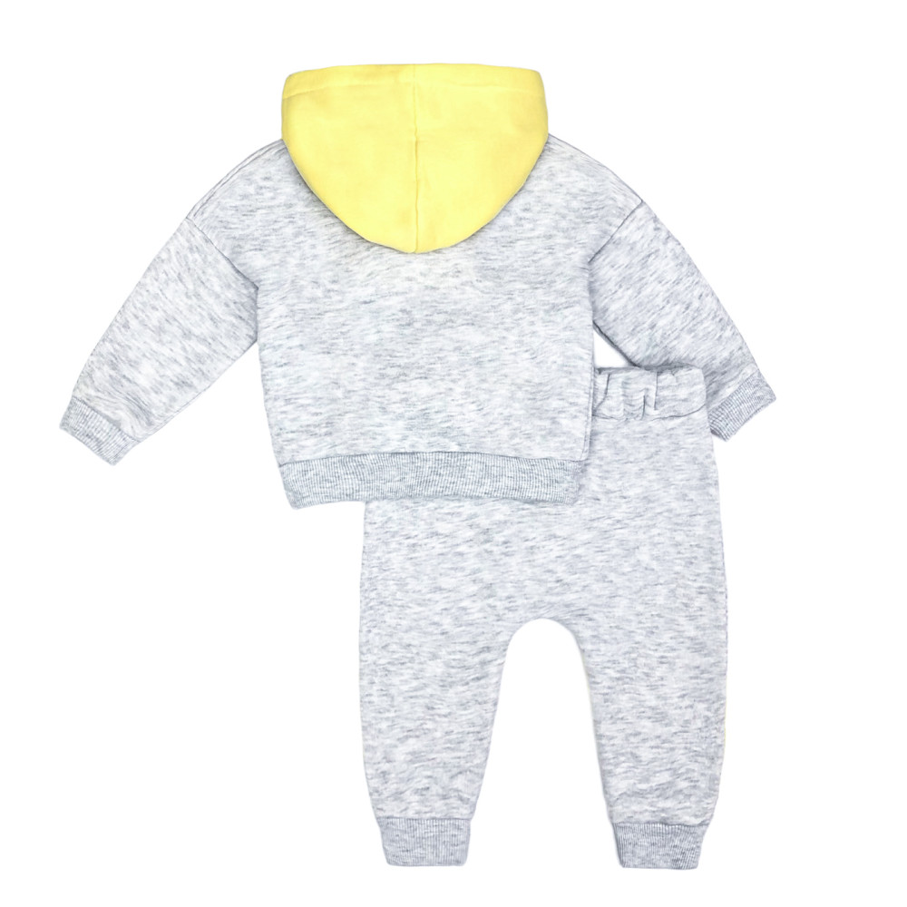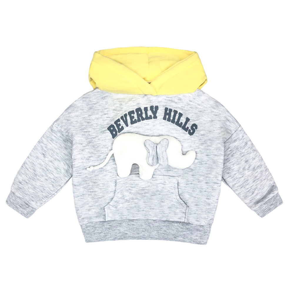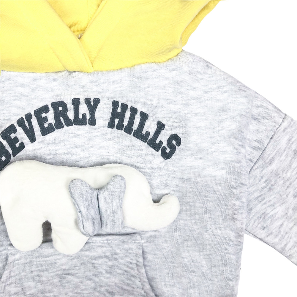 Βρεφικό σετ χειμερινής φόρμας με κουκούλα και ένα τρισδιάστατο λούτρινο βελουτέ ελεφαντάκι που ξεχωρίζει πάνω από την κεντρική μεγάλη τσέπη και αναγράφει “BEVERLY HILLS”. Το ελεφαντάκι έχει ουρίτσα που σχηματίζεται από ελεύθερο κορδόνι. Το ασορτί παντελόνι της φόρμας έχει τρισδιάστατες ρίγες που δημιουργούν οι οριζόντες υφασμάτινες λωρίδες και σετάρουν με την κουκούλα. Οι μανσέτες, το τελείωμα της μπλούζας και το τελείωμα του παντελονιού καταλήγουν σε rib ελαστικό. Όλο το σετ έχει εσωτερική επένδυση fleece.