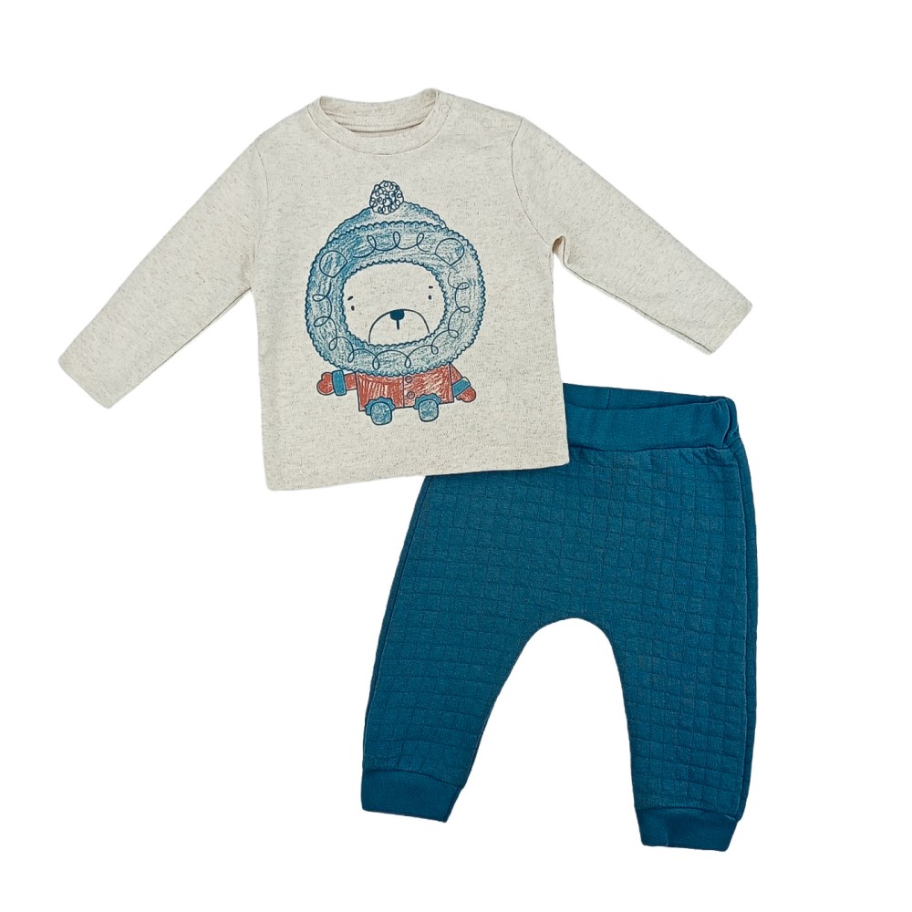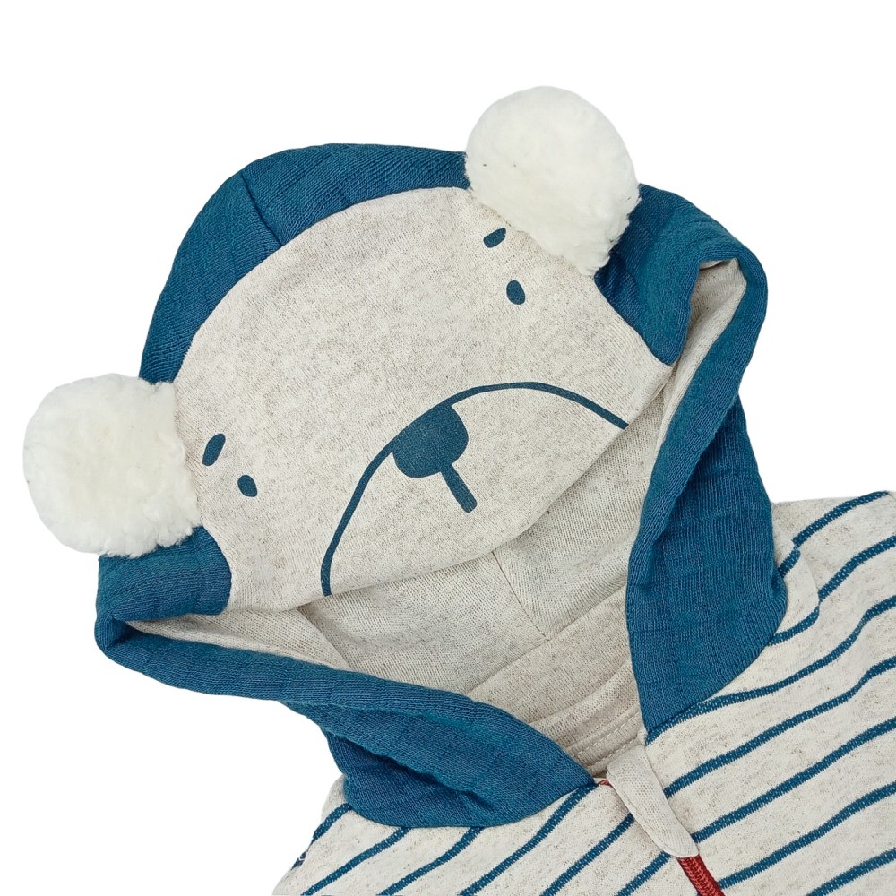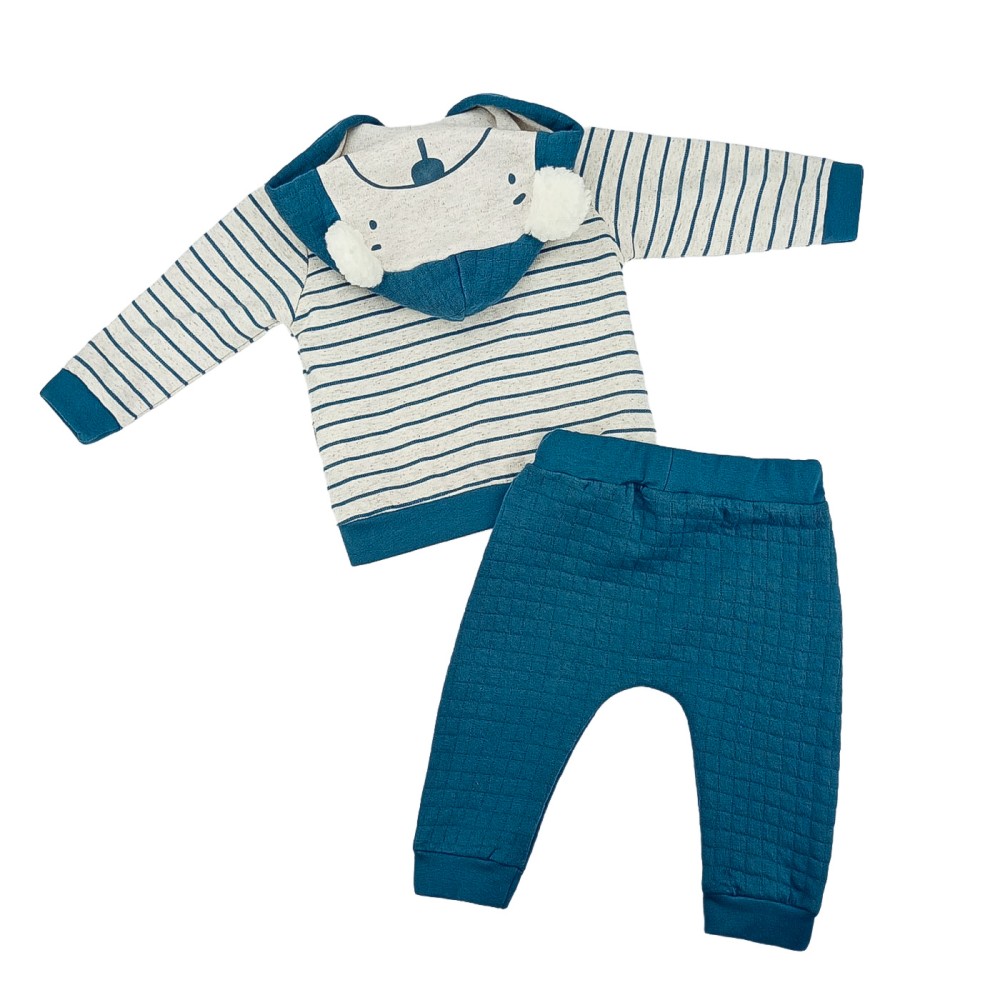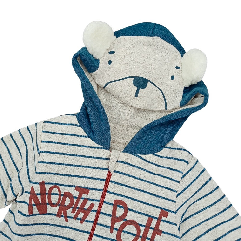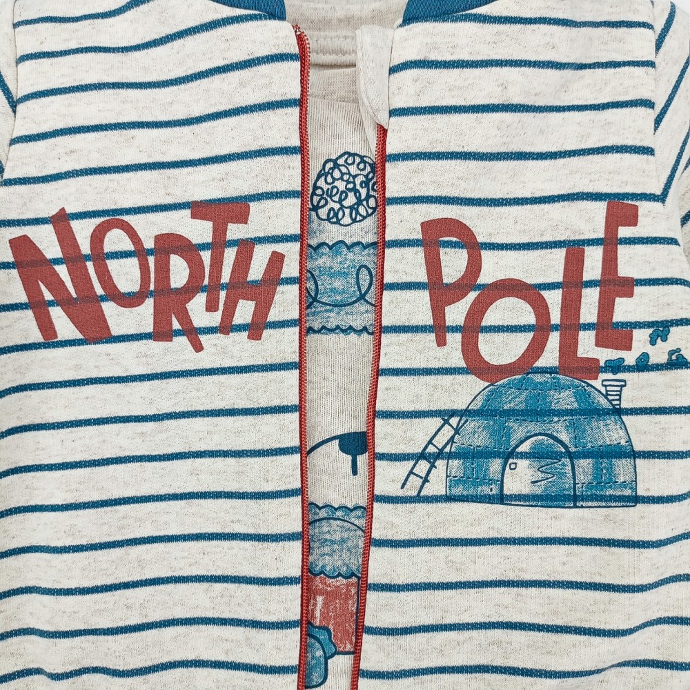 Σετ φόρμας για μωρό, που αποτελείται από 3 κομμάτια. Το τζάκετ φόρμας έχει κουκούλα με τρισδιάστατα αυτιά πολικής αρκούδας, είναι ριγέ μπεζ-πετρόλ και εικονίζει igloo. Η φράση NORTH POLE, με μπορντώ γράμματα, μοιράζεται δεξιά και αριστερά από το επίσης μπορντώ φερμουάρ. Οι μανσέτες και το ελαστικό τελείωμα στο κάτω μέρος του μπουφάν είναι πετρόλ όπως η κουκούλα και το παντελόνι της φόρμας. Το πετρόλ καπιτονέ ύφασμα στην κουκούλα έχει απλικαρισμένο ένα αρκουδάκι, με γούνινα λευκά 3D αυτάκια. Το σετ περιλαμβάνει μπεζ μακρυμάνικη μπλούζα με στάμπα από ένα αρκουδάκι-Εσκιμώο. Κλείνει με κουμπάκια τρουκς στη λαιμόκοψη για εύκολο πέρασμα του κεφαλιού και είναι 100% βαμβακερή, όπως και όλο το σετ. Το καπιτονέ παντελόνι της φόρμας είναι σε σύγχρονη γραμμή, στενό στο κάτω μέρος και ελαστικό στο τελείωμά του.