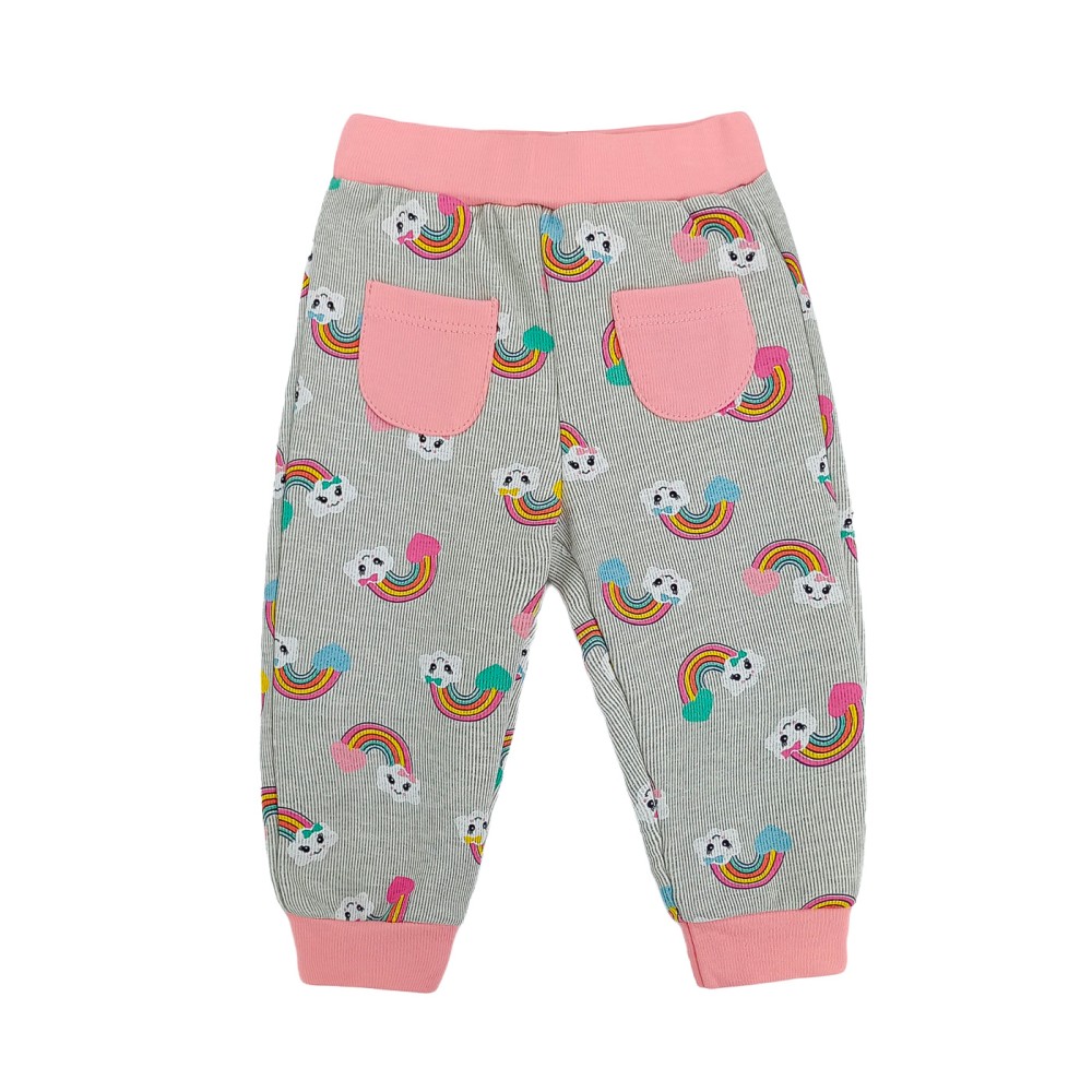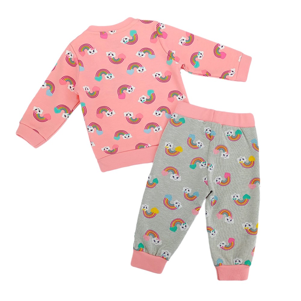 Χρωματιστή φόρμα, που αποτελείται από εμπριμέ ροζ μπλούζα, με ουράνια τόξα και τρισδιάστατη λέξη “STAR” με rainbow γράμματα. Συνδυάζεται με παντελόνι με λεπτές ρίγες, στην παλέτα του γκρι, που έχει ροζ ύφασμα στο λάστιχο της μέσης και στο ελαστικό τελείωμα του παντελονιού. Το παντελόνι μπροστά έχει 2 μικρά, ροζ τσεπάκια. Η μακρυμάνικη μπλούζα κλείνει δίπλα στη λαιμόκοψη με 2 κουμπάκια τρουκς, για να περνάει εύκολα το κεφαλάκι του μωρού! Είναι στολισμένη με χρωματιστά ουράνια τόξα, ενώ στις άκρες κάθε ουράνιου τόξου υπάρχουν χαρούμενα συννεφάκια και καρδούλες.
