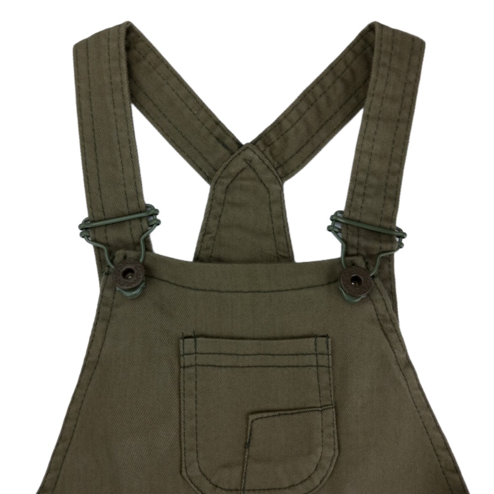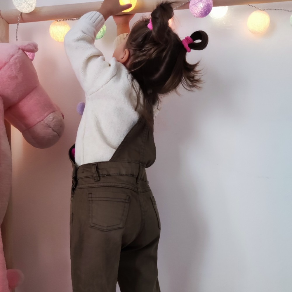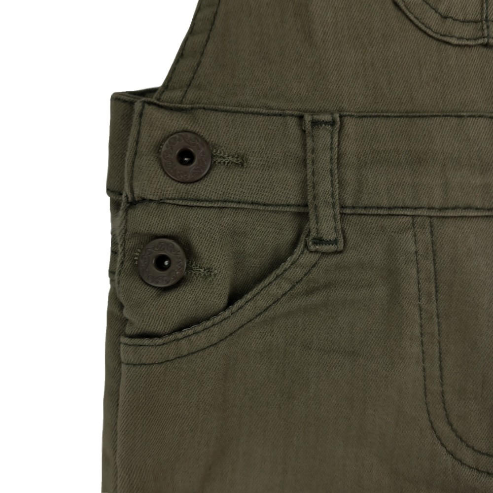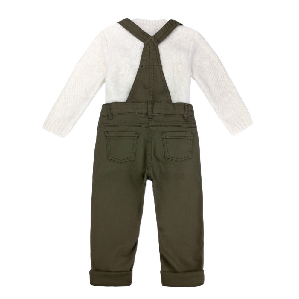 Παιδικό σετ για κοριτσάκι που αποτελείται από λαδί τζιν σαλοπέτα, συνδυασμένη με ιβουάρ πουλόβερ, με ιδιαίτερη πλέξη στο μπροστινό μέρος, και τρεις σειρές από τριδιάστατα, παιχνιδιάτικα πομ πομ. H σαλοπέτα έχει λαδί μεταλλικά κουμπιά και πόρπες στις τιράντες, ενώ στο εσωτερικό της μέσης υπάρχει λάστιχο με κουμπάκια που την κάνει προσαρμόσιμη στη μέση του παιδιού. Επίσης έχει 5 συνολικά τσέπες, συνυπολογίζοντας και την εξωτερική, που στολίζει χαριτωμένα το στήθος.