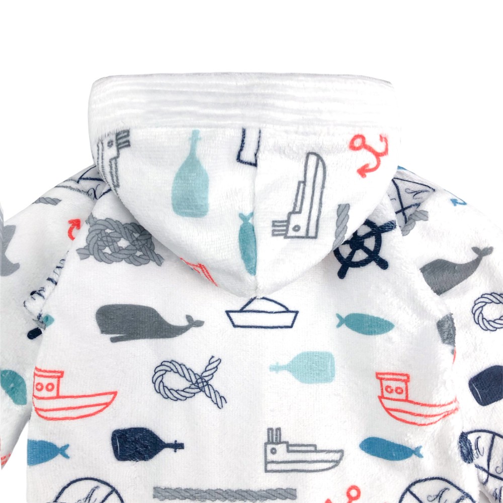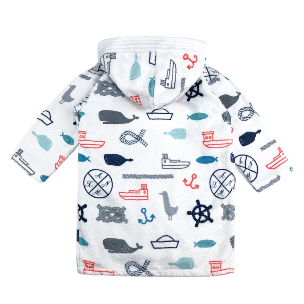 Unisex βρεφικό μπουρνούζι με κουκούλα, ενσωματωμένη ζώνη και τσεπάκι. Είναι one size και καλύπτει βρέφη και μωρά από 0-1,5 ετών. Ένα μοτίβο με ναυτική θεματική στολίζει το εξωτερικό μέρος, που έχει απαλή, σχεδόν βελούδινη υφή. Εικονίζονται πλοία, ναυτικοί κόμποι, τιμόνια καπετάνιου, άγκυρες και ψαράκια. Το εσωτερικό, πετσετέ κομμάτι είναι βαμβακερό και λευκό, ενώ το μπουρνούζι δένει με ζώνη στο ίδιο χρωματικό μοτίβο. Γύρω από την κουκούλα υπάρχει λευκό τελείωμα με ανάγλυφη, εξίσου απαλή υφή. Στη δεξιά μεριά υπάρχει μια τσέπη. Μπορεί να αποτελέσει ένα χρηστικό δώρο με μεγάλη διάρκεια ζωής!